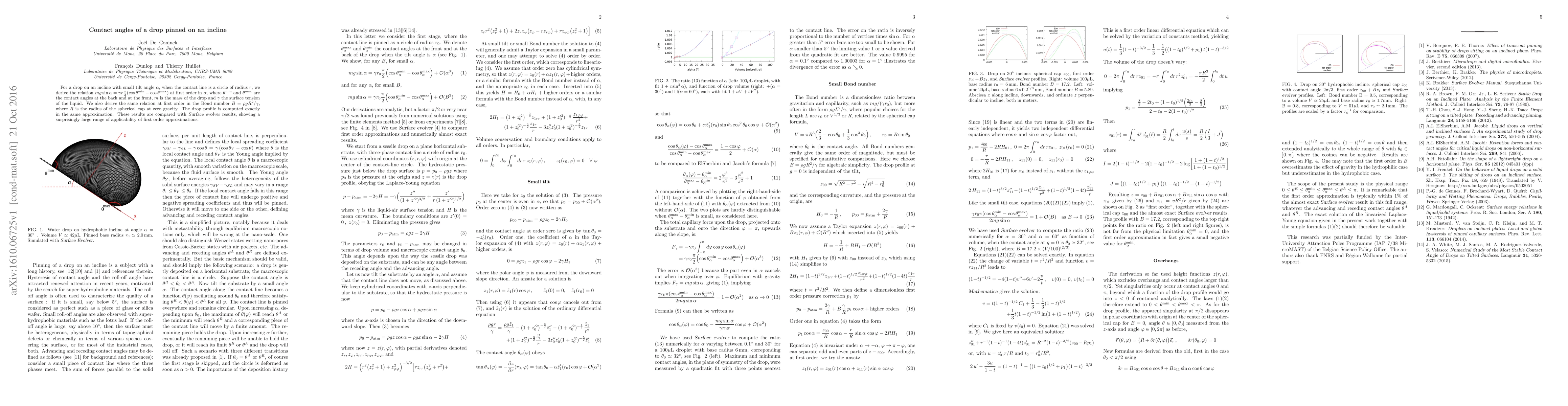The research uses analytic derivations and compares results with Surface Evolver simulations, focusing on a drop pinned on an incline with small tilt angle or Bond number, where the contact line is a circle.