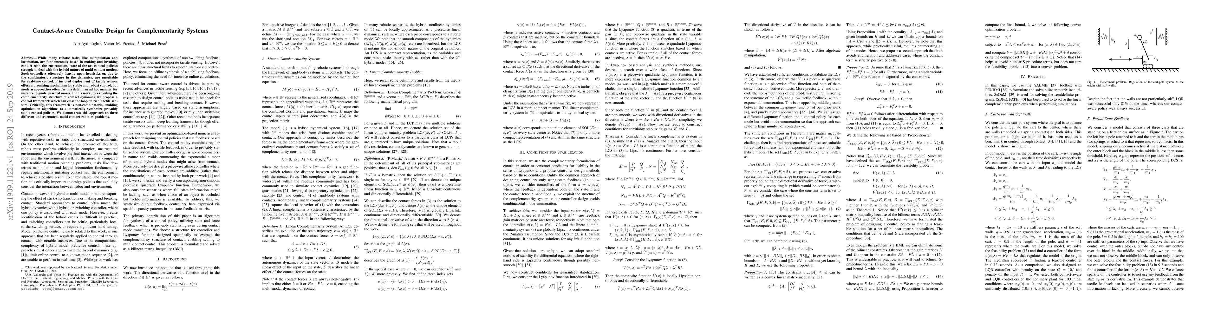 While many robotic tasks, like manipulation and locomotion, are fundamentally based in making and breaking contact with the environment, state-of-the-art control policies struggle to deal with the hybrid nature of multi-contact motion. Such controllers often rely heavily upon heuristics or, due to the combinatoric structure in the dynamics, are unsuitable for real-time control. Principled deployment of tactile sensors offers a promising mechanism for stable and robust control, but modern approaches often use this data in an ad hoc manner, for instance to guide guarded moves. In this work, by exploiting the complementarity structure of contact dynamics, we propose a control framework which can close the loop on rich, tactile sensors. Critically, this framework is non-combinatoric, enabling optimization algorithms to automatically synthesize provably stable control policies. We demonstrate this approach on three different underactuated, multi-contact robotics problems.