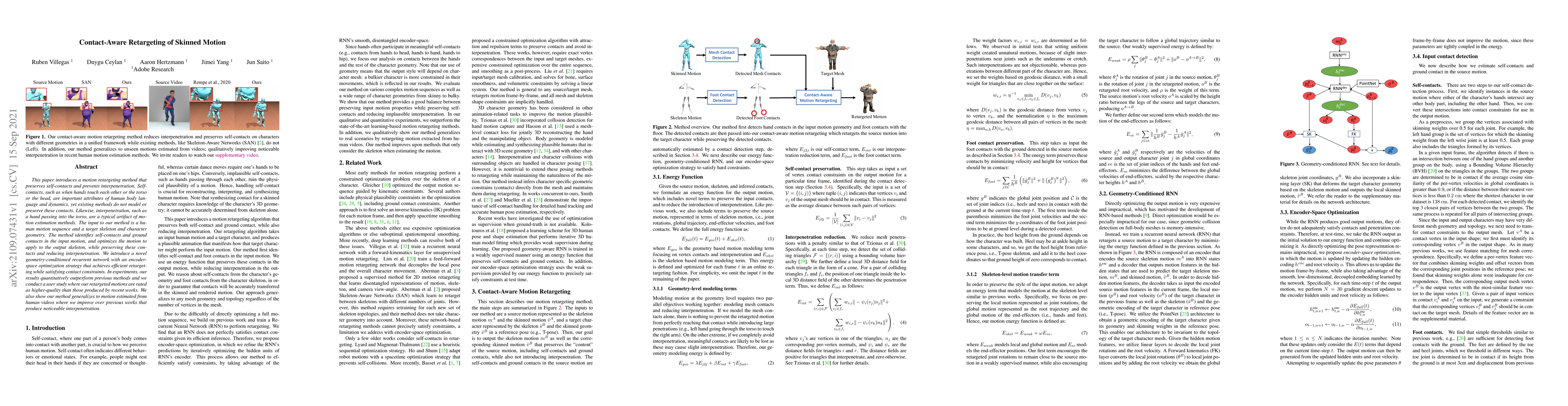 This paper introduces a novel motion retargeting method that preserves self-contacts and prevents interpenetration, using a geometry-conditioned recurrent network and an encoder-space optimization strategy. Experimental results show superior performance over previous methods in both quantitative metrics and user-rated quality.