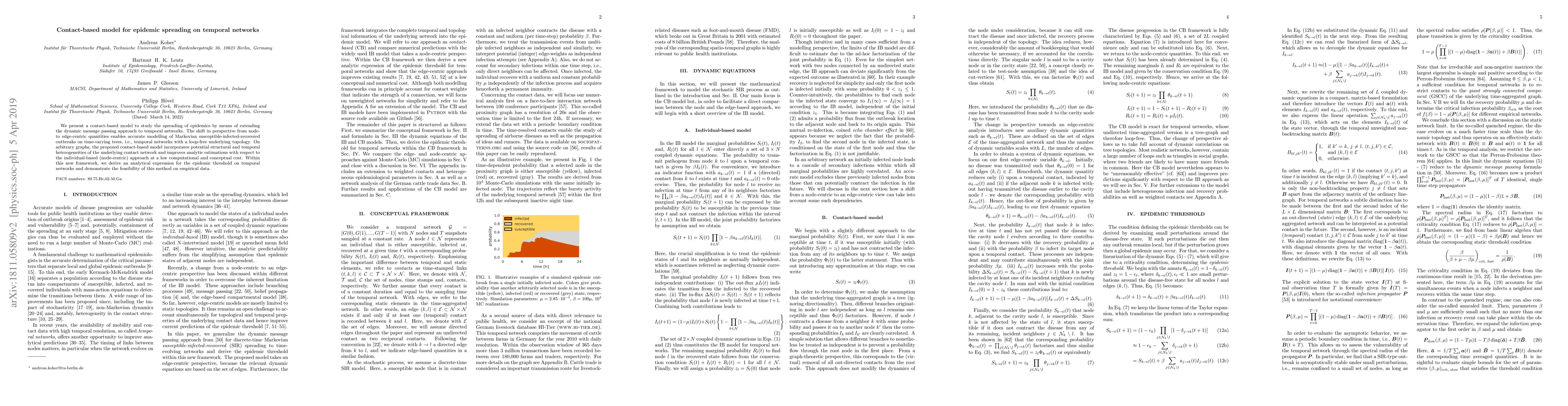 We present a contact-based model to study the spreading of epidemics by means of extending the dynamic message passing approach to temporal networks. The shift in perspective from node- to edge-centric quantities enables accurate modelling of Markovian susceptible-infected-recovered outbreaks on time-varying trees, i.e., temporal networks with a loop-free underlying topology. On arbitrary graphs, the proposed contact-based model incorporates potential structural and temporal heterogeneities of the underlying contact network and improves analytic estimations with respect to the individual-based (node-centric) approach at a low computational and conceptual cost. Within this new framework, we derive an analytical expression for the epidemic threshold on temporal networks and demonstrate the feasibility of this method on empirical data.
