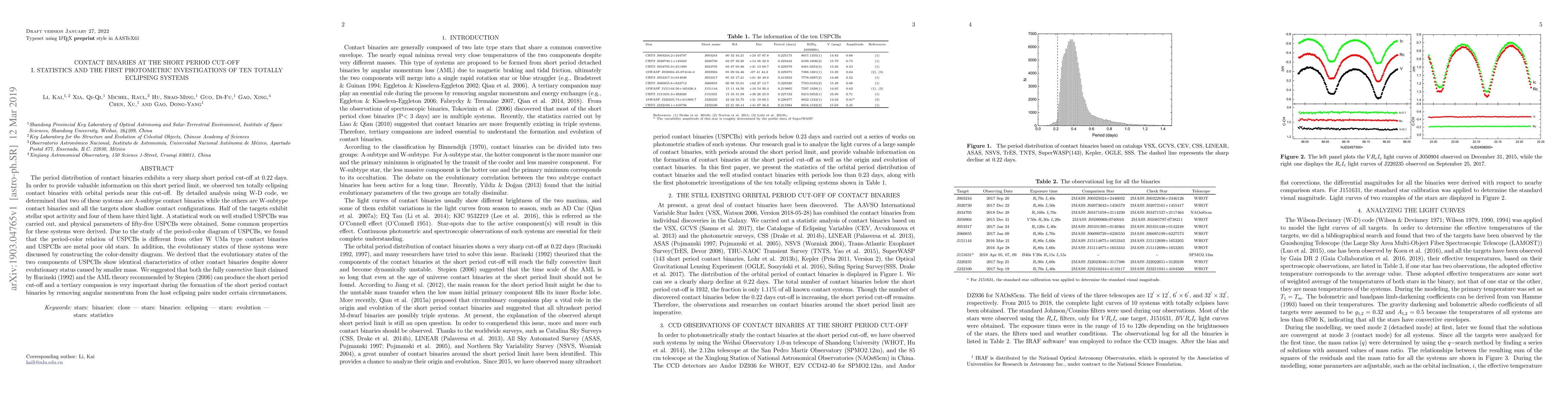 This paper investigates the sharp short period cut-off at 0.22 days in contact binaries, observing ten eclipsing systems near this limit and finding they are mostly W-subtype with shallow contact configurations. The study also reveals that USPCBs are metal-poor old stars with a different period-color relation compared to other W UMa binaries, suggesting the short period cut-off can be produced by both fully convective limits and tertiary companions.