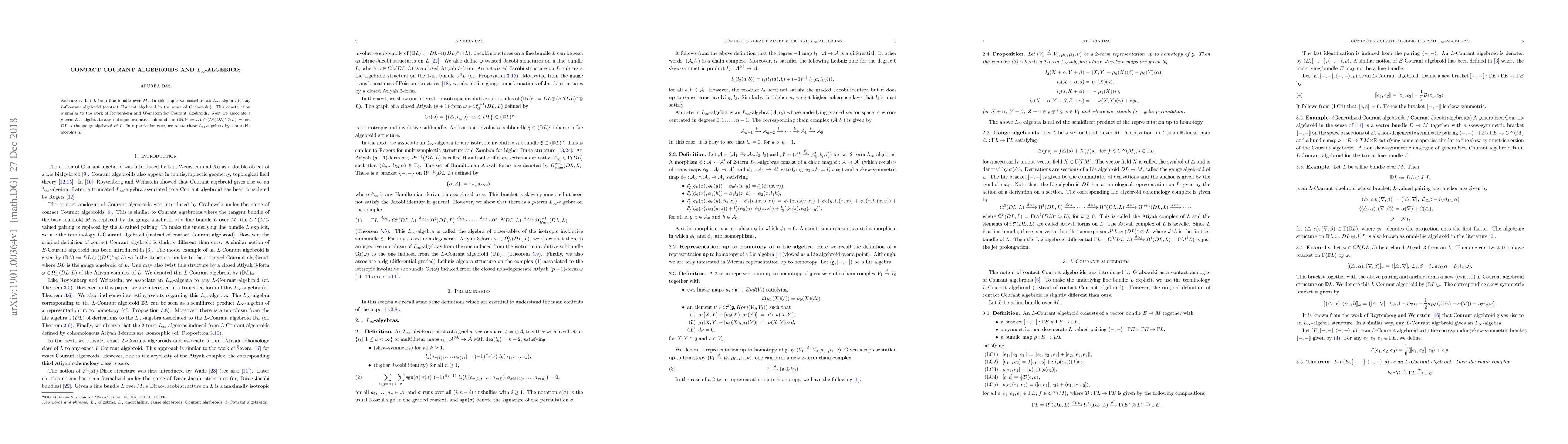 Let $L$ be a line bundle over $M$. In this paper we associate an $L_\infty$-algebra to any $L$-Courant algebroid (contact Courant algebroid in the sense of Grabowski). This construction is similar to the work of Roytenberg and Weinstein for Courant algebroids. Next we associate a $p$-term $L_\infty$-algebra to any isotropic involutive subbundle of $(\mathbb{D}L)^p := DL \oplus (\wedge^p (DL)^* \otimes L)$, where $DL$ is the gauge algebroid of $L$. In a particular case, we relate these $L_\infty$-algebras by a suitable morphism.