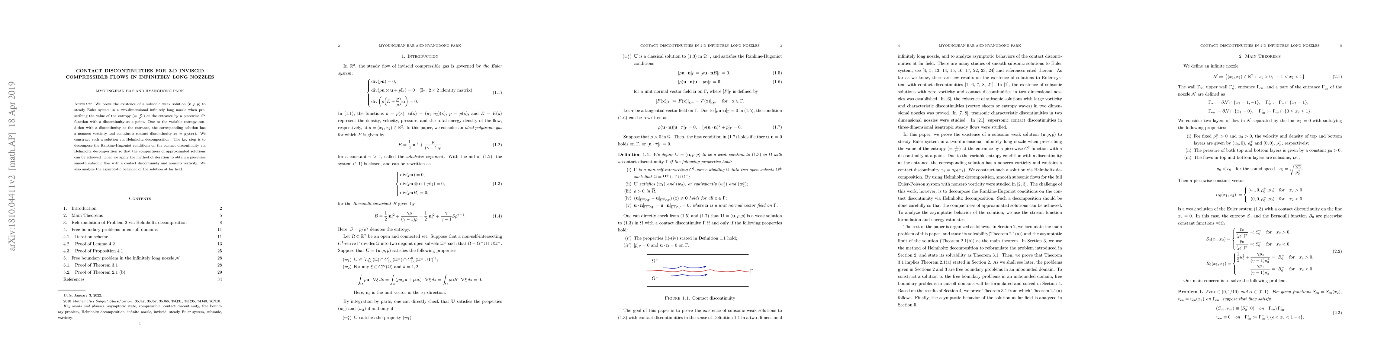 This paper proves the existence of a subsonic weak solution for the steady Euler equations in a 2-D infinitely long nozzle with a discontinuous entropy at the entrance, leading to a contact discontinuity and nonzero vorticity. The solution is constructed using Helmholtz decomposition and the method of iteration.