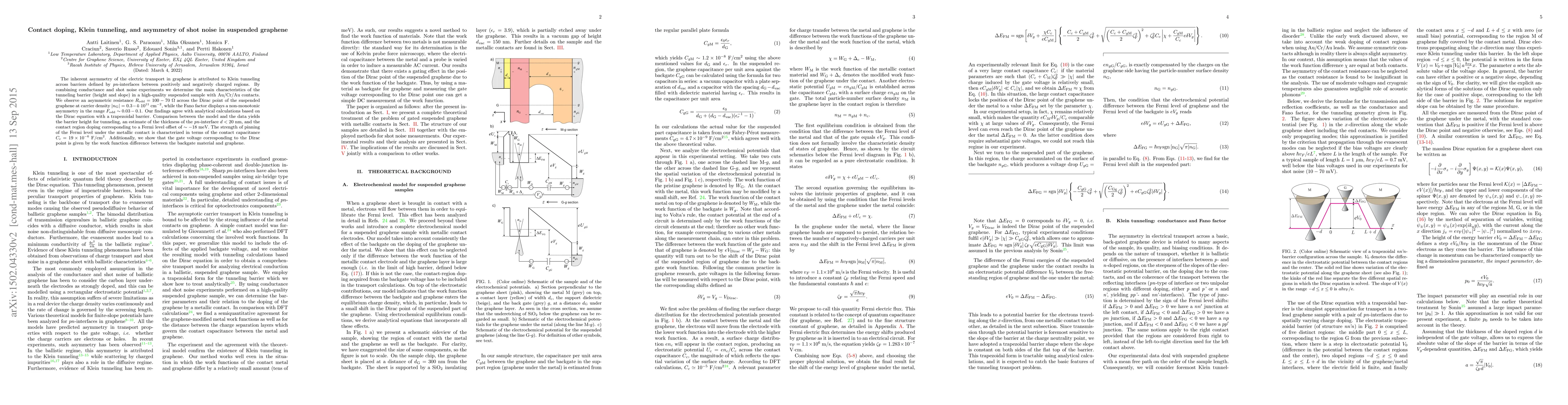 This study investigates the asymmetry in electrical transport in suspended graphene via contact doping and Klein tunneling. Experiments reveal an asymmetric resistance and non-monotonic shot noise, consistent with Klein tunneling across a pn-interface barrier, providing estimates for barrier height, interface thickness, and Fermi level offset.