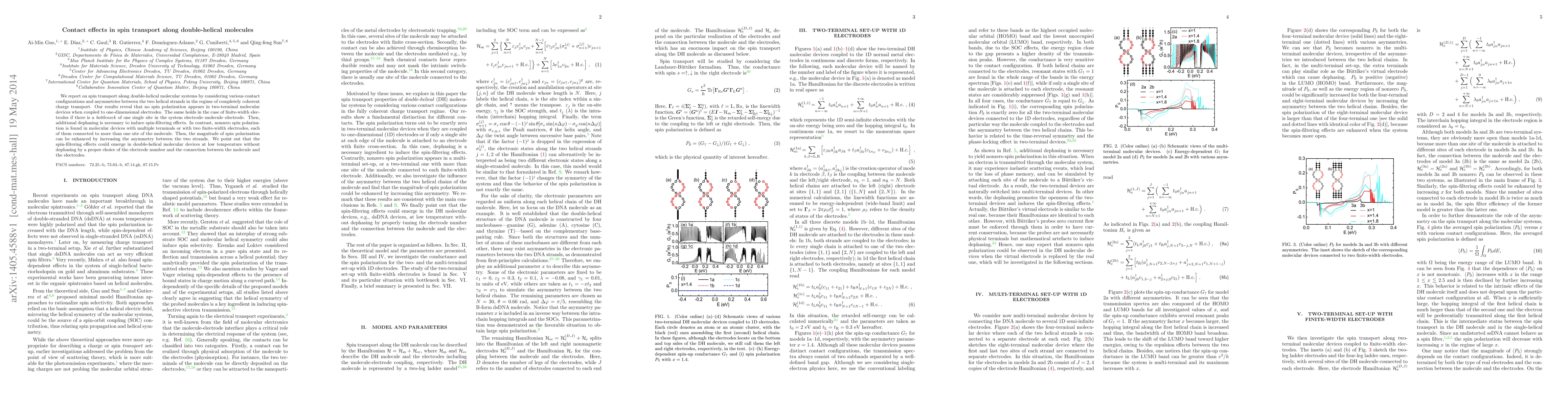 We report on spin transport along double-helical molecular systems by considering various contact configurations and asymmetries between the two helical strands in the regime of completely coherent charge transport. Our results reveal that no spin polarization appears in two-terminal molecular devices when coupled to one-dimensional electrodes. The same holds in the case of finite-width electrodes if there is a \emph{bottleneck} of one single site in the system electrode--molecule--electrode. Then, additional dephasing is necessary to induce spin-filtering effects. In contrast, nonzero spin polarization is found in molecular devices with multiple terminals or with two finite-width electrodes, each of them connected to more than one site of the molecule. Then, the magnitude of spin polarization can be enhanced by increasing the asymmetry between the two strands. We point out that the spin-filtering effects could emerge in double-helical molecular devices at low temperature without dephasing by a proper choice of the electrode number and the connection between the molecule and the electrodes.