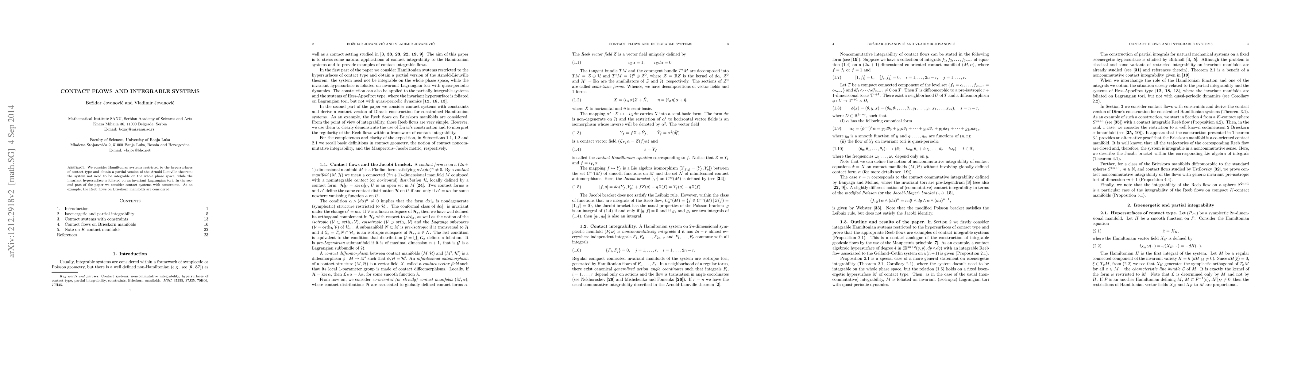 This paper explores Hamiltonian systems on contact hypersurfaces, proving a partial version of the Arnold-Liouville theorem where invariant Lagrangian tori exist even if the system isn't globally integrable. It also examines contact systems with constraints, specifically analyzing Reeb flows on Brieskorn manifolds.