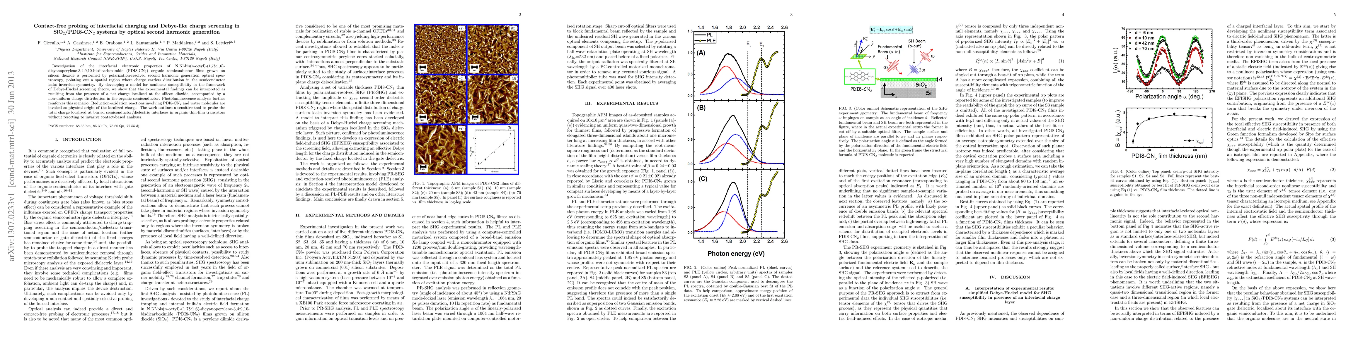 Investigation of the interfacial electronic properties of N,N'-bis(n-octyl)-(1,7&1,6)-dicyanoperylene-3,4:9,10-bisdicarboximide (PDI8-CN2) organic semiconductor films grown on silicon dioxide is performed by polarization-resolved second harmonic generation optical spectroscopy, pointing out a spatial region where charge carriers distribution in the semiconductor lacks inversion symmetry. By developing a model for nonlinear susceptibility in the framework of Debye-Huckel screening theory, we show that the experimental findings can be interpreted as resulting from the presence of a net charge localized at the silicon dioxide, accompanied by a non-uniform charge distribution in the organic semiconductor. Photoluminescence analysis further reinforces this scenario. Reduction-oxidation reactions involving PDI8-CN2 and water molecules are invoked as physical origin of the localized charge. The work outlines a sensitive tool to probe the total charge localized at buried semiconductor/dielectric interfaces in organic thin-film transistors without resorting to invasive contact-based analyses.