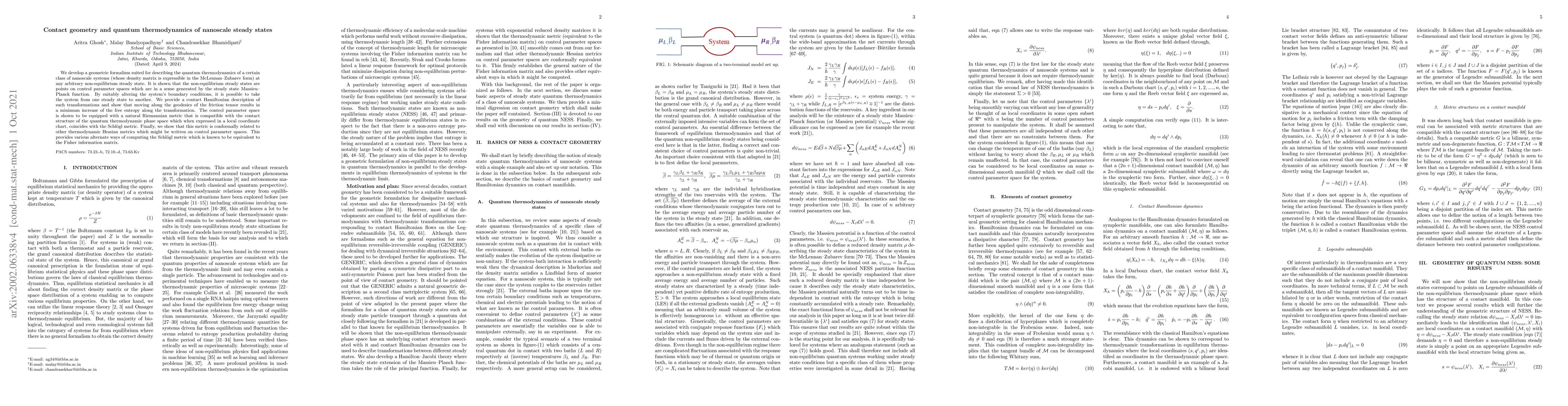 We develop a geometric formalism suited for describing the quantum thermodynamics of a certain class of nanoscale systems (whose density matrix is expressible in the McLennan--Zubarev form) at any arbitrary non-equilibrium steady state. It is shown that the non-equilibrium steady states are points on control parameter spaces which are in a sense generated by the steady state Massieu--Planck function. By suitably altering the system's boundary conditions, it is possible to take the system from one steady state to another. We provide a contact Hamiltonian description of such transformations and show that moving along the geodesics of the friction tensor results in a minimum increase of the free entropy along the transformation. The control parameter space is shown to be equipped with a natural Riemannian metric that is compatible with the contact structure of the quantum thermodynamic phase space which when expressed in a local coordinate chart, coincides with the Schl\"{o}gl metric. Finally, we show that this metric is conformally related to other thermodynamic Hessian metrics which might be written on control parameter spaces. This provides various alternate ways of computing the Schl\"{o}gl metric which is known to be equivalent to the Fisher information matrix.