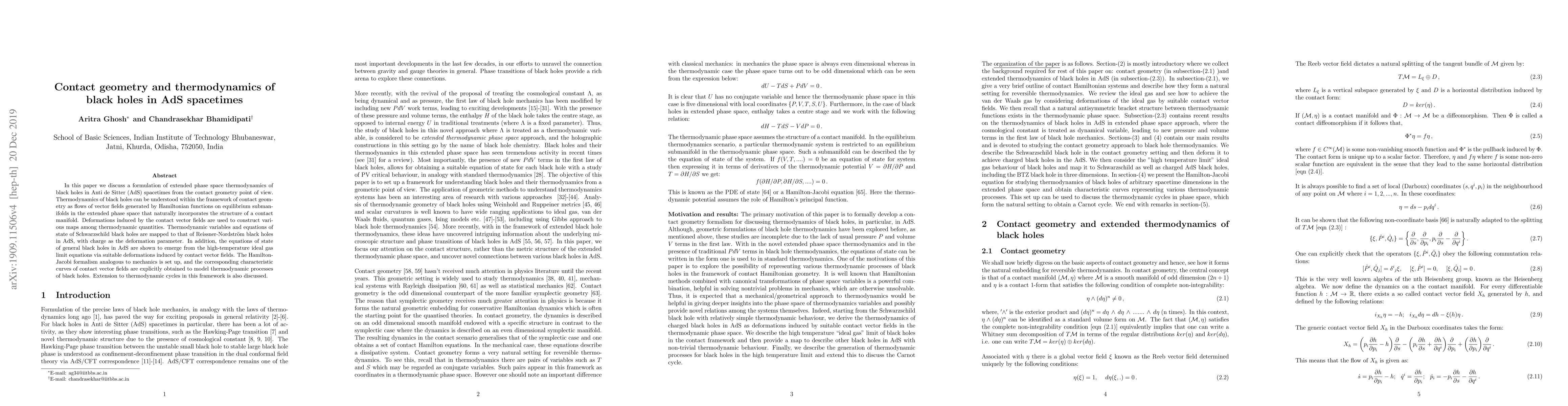This paper explores the thermodynamics of black holes in AdS spacetimes through the lens of contact geometry, establishing a framework where thermodynamic processes are modeled by vector fields generated by Hamiltonian functions on equilibrium submanifolds. It demonstrates how deformations via contact vector fields can map thermodynamic variables and equations of state, extending from Schwarzschild to Reissner-Nordström black holes and revealing the emergence of AdS black hole thermodynamics from high-temperature ideal gas limits.