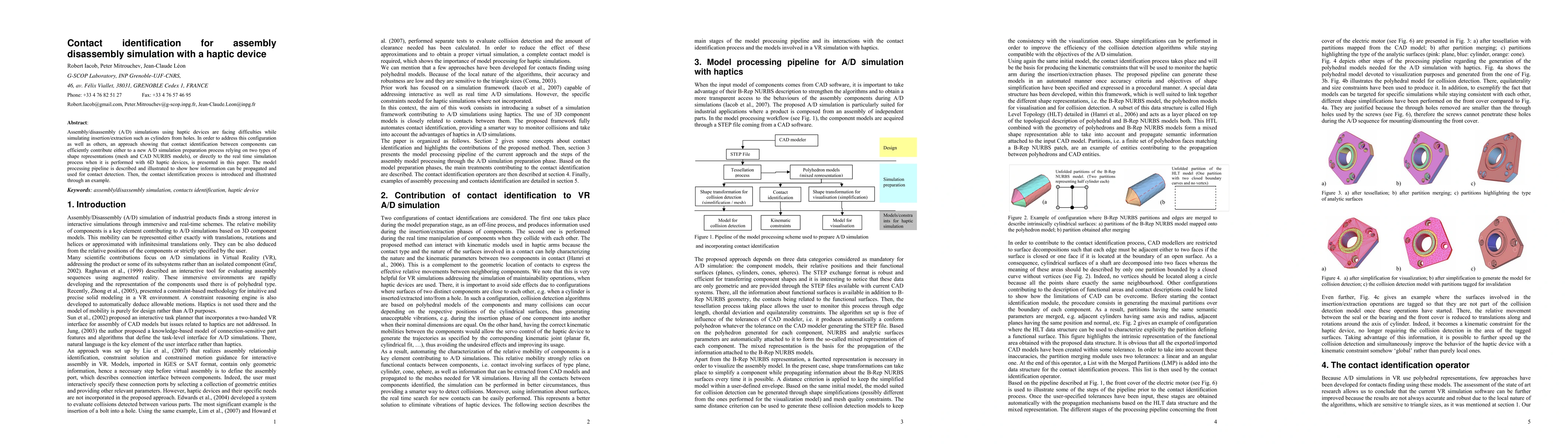 Assembly/Disassembly (A/D) simulations using haptic devices are facing difficulties while simulating insertion/extraction operations such as removing cylinders from holes. In order to address this configuration as well as others, an approach based on contact identification between components is presented in this paper. This approach can efficiently contribute either to a new A/D simulation preparation process relying on two types of shape representations (mesh and CAD NURBS models), or directly to the real time simulation process when it is performed with 6D haptic devices. The model processing pipeline is described and illustrated to show how information can be propagated and used for contact detection. Then, the contact identification process is introduced and illustrated through an example