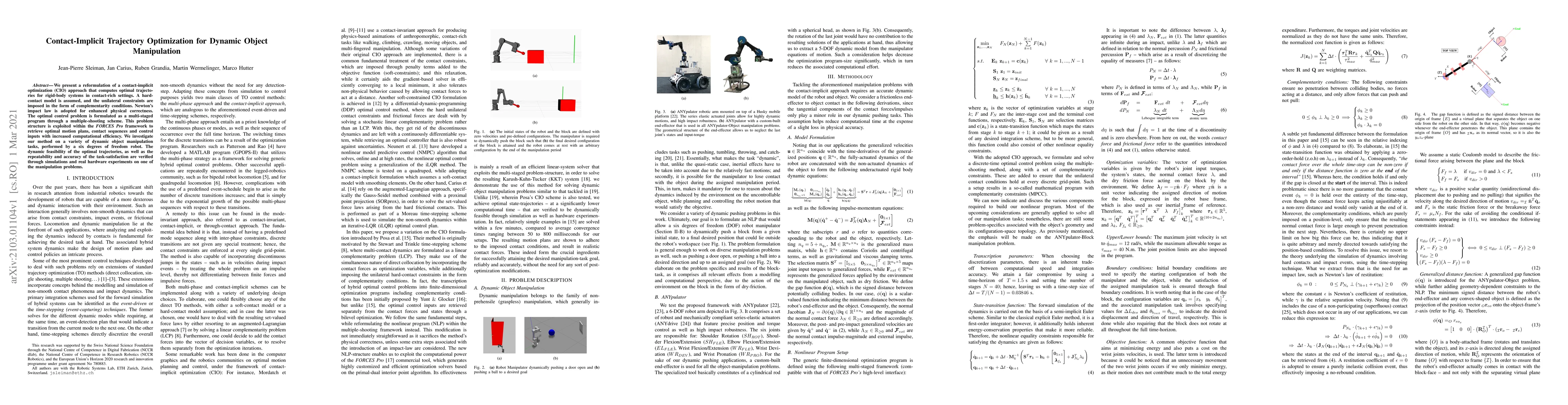 This paper reformulates contact-implicit optimization to compute optimal trajectories for rigid-body systems in contact-rich environments, employing a multiple-shooting scheme within the FORCES Pro framework for efficient computation. The method's effectiveness is demonstrated through dynamic object manipulation tasks by a six-DOF robot, validated via simulations and real-world experiments.