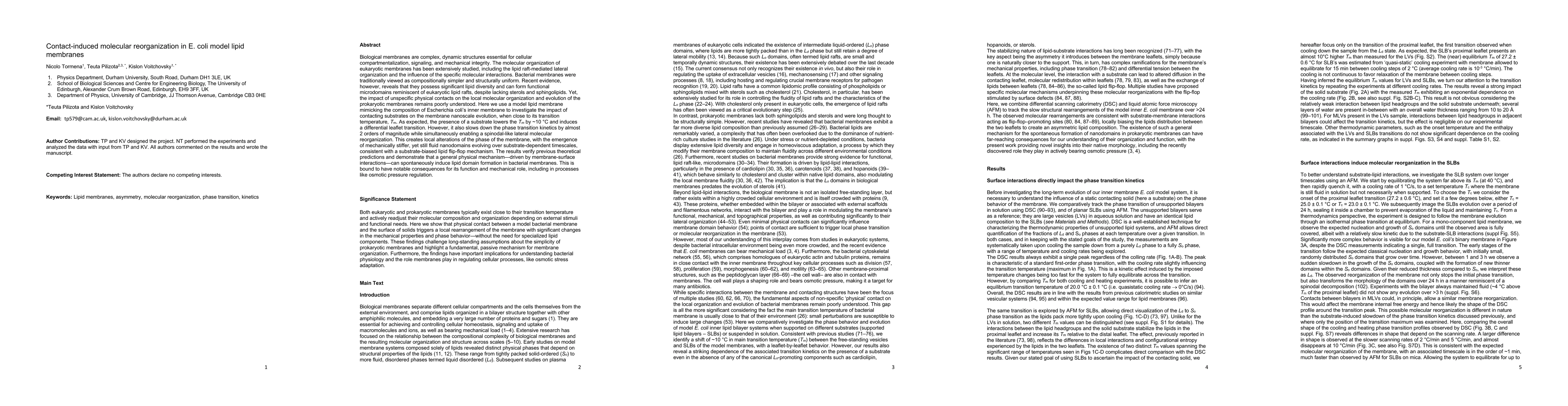 This research investigates the impact of contacting surfaces on the molecular organization of E. coli's inner membrane lipids, near its transition temperature. Findings reveal that substrate contact lowers the transition temperature, alters leaflet transitions, and slows down phase transition kinetics. It also induces a spinodal-like molecular reorganization, creating stiffer yet fluid nanodomains, indicating a substrate-biased lipid flip-flop mechanism. This suggests a physical mechanism for spontaneous lipid domain formation in bacterial membranes, with implications for their function and mechanical roles.
