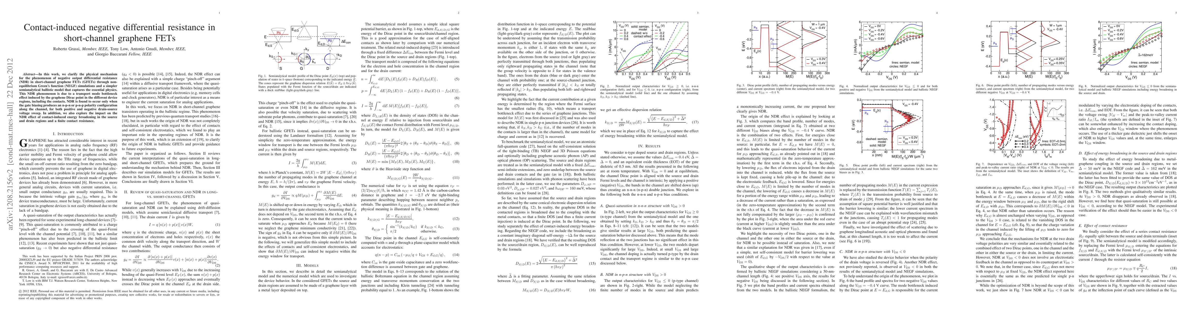 Summary: This study elucidates the mechanism behind negative differential resistance (NDR) in short-channel graphene FETs through NEGF simulations and a semianalytical model, identifying a transport mode bottleneck due to the graphene Dirac point. NDR is observed under specific gate bias configurations and is influenced by contact-induced energy broadening and finite contact resistance.