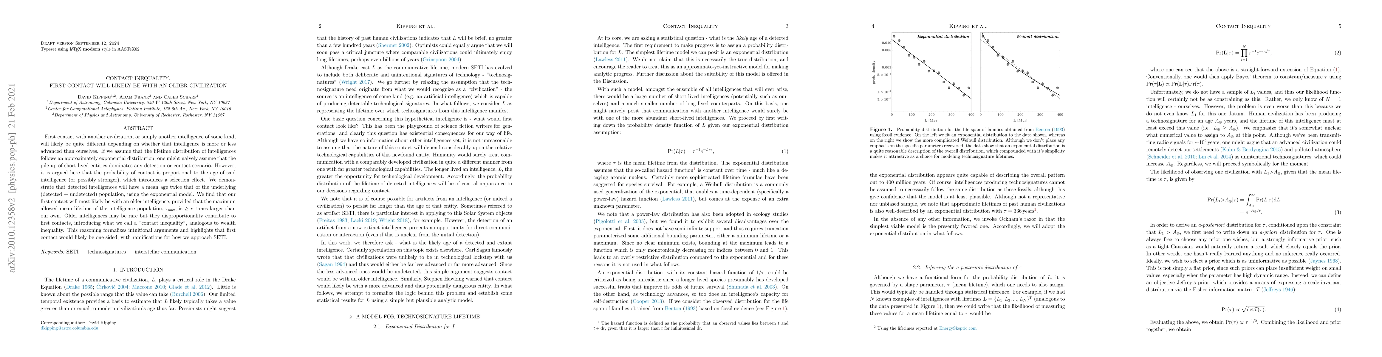 First contact with another civilization, or simply another intelligence of some kind, will likely be quite different depending on whether that intelligence is more or less advanced than ourselves. If we assume that the lifetime distribution of intelligences follows an approximately exponential distribution, one might naively assume that the pile-up of short-lived entities dominates any detection or contact scenario. However, it is argued here that the probability of contact is proportional to the age of said intelligence (or possibly stronger), which introduces a selection effect. We demonstrate that detected intelligences will have a mean age twice that of the underlying (detected + undetected) population, using the exponential model. We find that our first contact will most likely be with an older intelligence, provided that the maximum allowed mean lifetime of the intelligence population, $\tau_{\rm max}$, is $>e$ times larger than our own. Older intelligences may be rare but they disproportionality contribute to first contacts, introducing what we call a 'contact inequality', analogous to wealth inequality. This reasoning formalizes intuitional arguments and highlights that first contact would likely be one-sided, with ramifications for how we approach SETI.