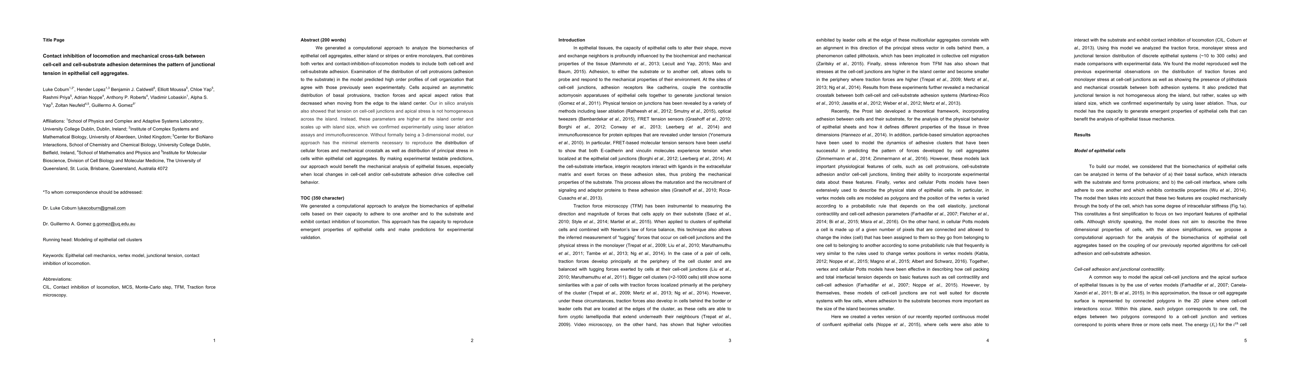 This paper develops a computational model to analyze the biomechanics of epithelial cell aggregates, showing that contact inhibition of locomotion and mechanical cross-talk between cell-cell and cell-substrate adhesion determine the pattern of junctional tension. The model predicts asymmetric distribution of cellular forces and higher tension at the island center, confirmed experimentally.