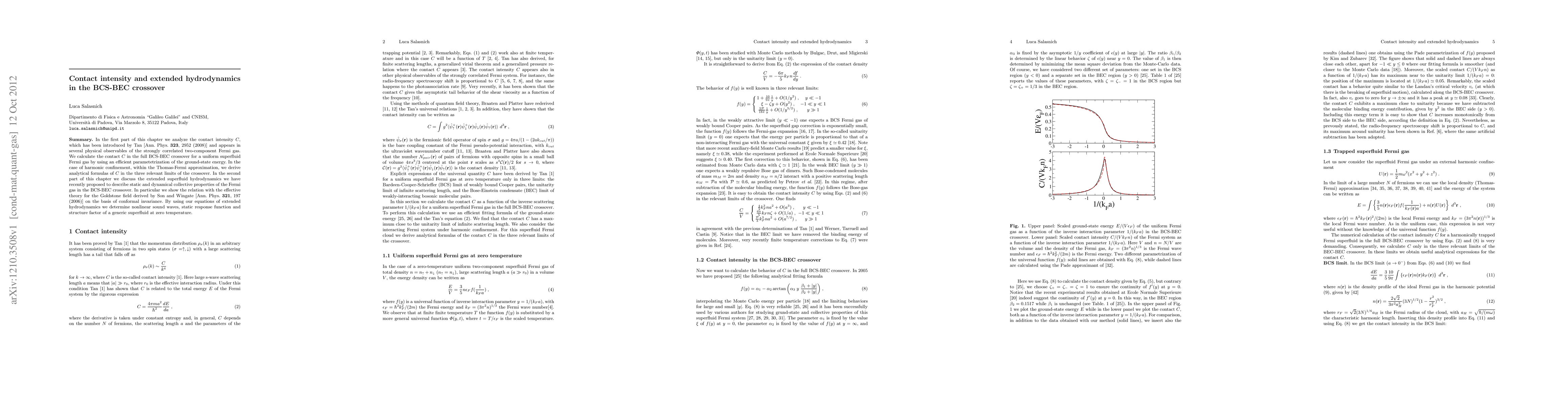 This paper calculates the contact intensity $C$ in the BCS-BEC crossover for a uniform superfluid Fermi gas and derives analytical formulas for $C$ under harmonic confinement. It also discusses extended superfluid hydrodynamics, relating it to the effective theory for the Goldstone field, and uses these equations to determine nonlinear sound waves, static response, and structure factor.