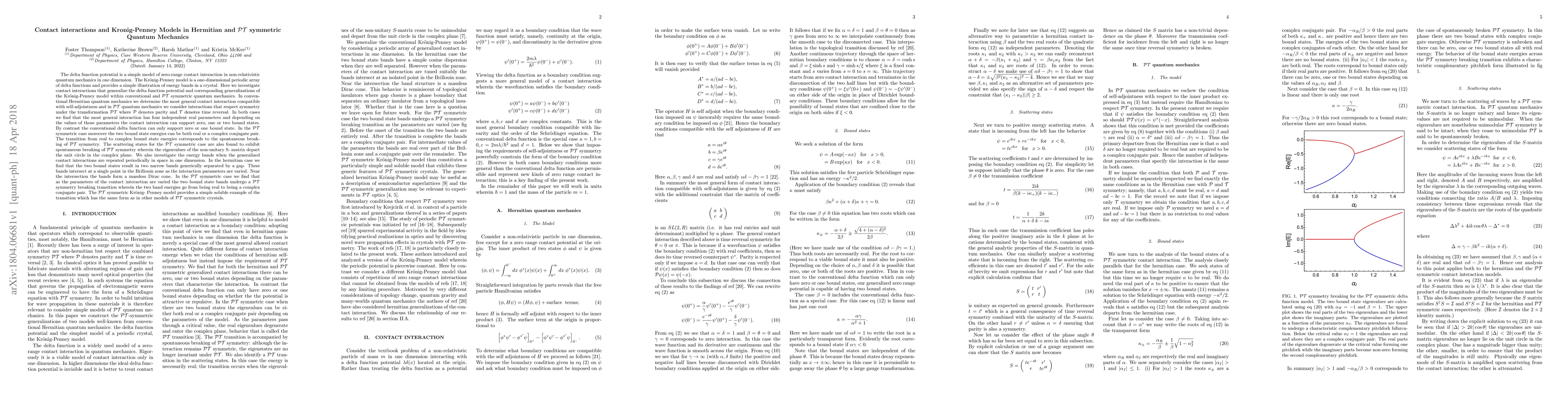 The delta function potential is a simple model of zero-range contact interaction in one dimension. The Kronig-Penney model is a one-dimensional periodic array of delta functions that models the energy bands in a crystal. Here we investigate contact interactions that generalize the delta function potential and corresponding generalizations of the Kronig-Penney model within conventional and parity-time symmetric quantum mechanics (PTQM). In conventional quantum mechanics we determine the most general contact interaction compatible with self-adjointness; in PTQM we consider interactions that are symmetric under the combined transformation PT. In both cases we find that the most general interaction has four independent real parameters; depending on the parameter values the interaction can support more bound states than the conventional delta function. In the PT case the two bound state energies can be both real or a complex conjugate pair, with the transition corresponding to the breaking of PT-symmetry. The scattering states for the PT case are also found to exhibit spontaneous breaking of PT-symmetry. We investigate the energy bands when the generalized contact interactions are repeated periodically in space in one dimension. In the Hermitian case we find that the two bound states result in two narrow bands generically separated by a gap. These bands intersect at a single point in the Brillouin zone as the interaction parameters are varied. Near the intersection the bands form a massless Dirac cone. In the PT-symmetric case, as the parameters of the contact interaction are varied the two bound state bands undergo a PT-symmetry breaking transition wherein the two band energies go from being real to being a complex conjugate pair. The PT-symmetric Kronig-Penney model provides a simple soluble example of the transition which has the same form as in other models of PT-symmetric crystals.