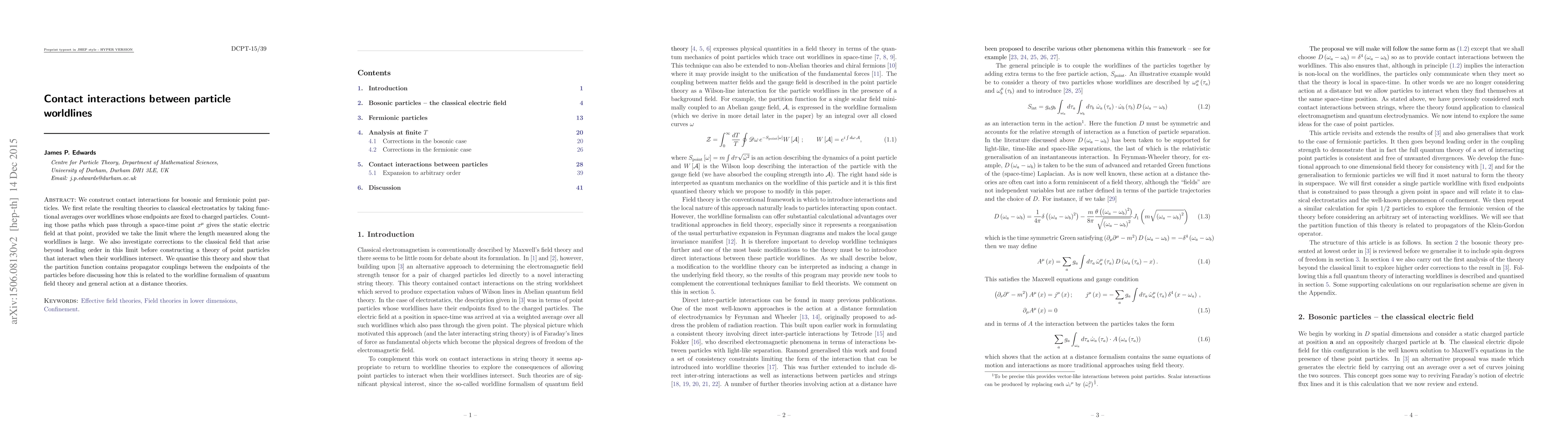 We construct contact interactions for bosonic and fermionic point particles. We first relate the resulting theories to classical electrostatics by taking functional averages over worldlines whose endpoints are fixed to charged particles. Counting those paths which pass through a space-time point $x^{\mu}$ gives the static electric field at that point, provided we take the limit where the length measured along the worldlines is large. We also investigate corrections to the classical field that arise beyond leading order in this limit before constructing a theory of point particles that interact when their worldlines intersect. We quantise this theory and show that the partition function contains propagator couplings between the endpoints of the particles before discussing how this is related to the worldline formalism of quantum field theory and general action at a distance theories.