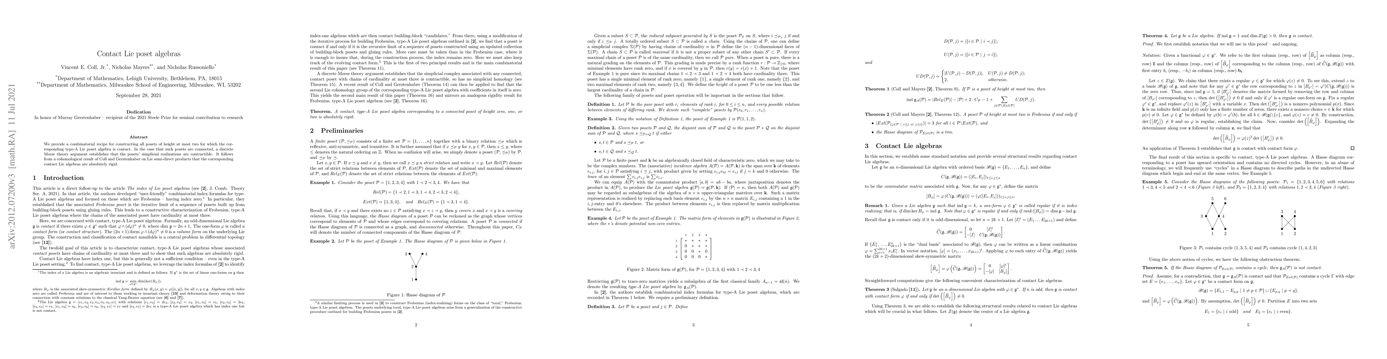 We provide a combinatorial recipe for constructing all posets of height at most two for which the corresponding type-A Lie poset algebra is contact. In the case that such posets are connected, a discrete Morse theory argument establishes that the posets' simplicial realizations are contractible. It follows from a cohomological result of Coll and Gerstenhaber on Lie semi-direct products that the corresponding contact Lie algebras are absolutely rigid.