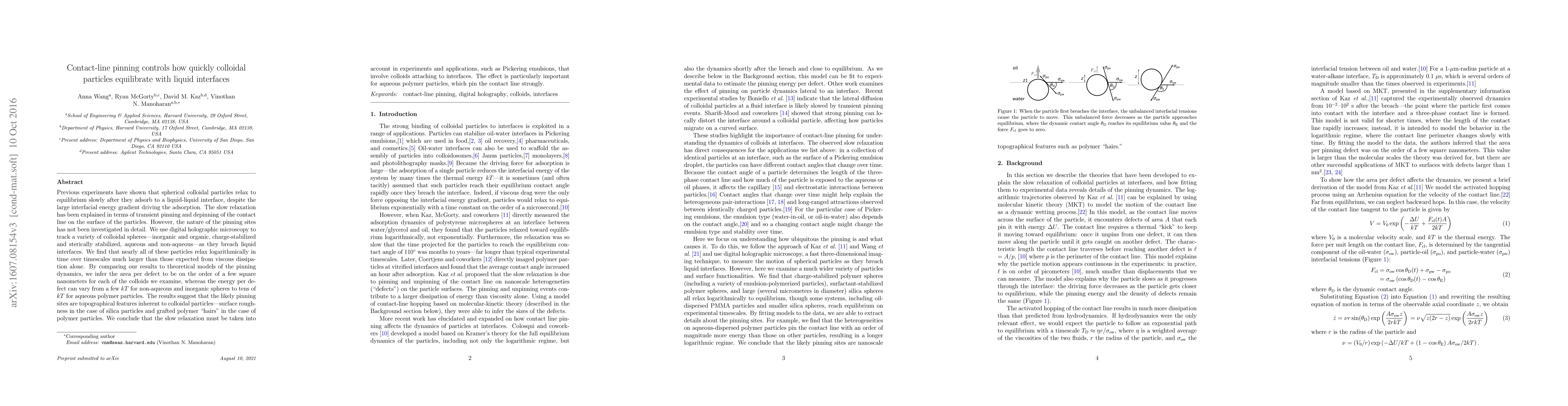 Colloidal particles relax to equilibrium slowly due to pinning at their interfaces, with varying energy per defect depending on particle properties; this effect affects applications like Pickering emulsions.