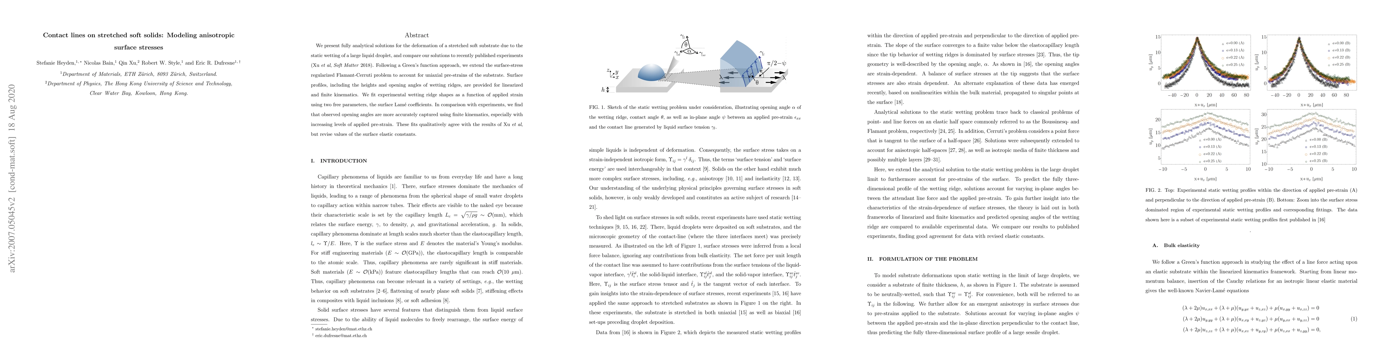 We present fully analytical solutions for the deformation of a stretched soft substrate due to the static wetting of a large liquid droplet, and compare our solutions to recently published experiments (Xu et al, Soft Matter 2018). Following a Green's function approach, we extend the surface-stress regularized Flamant-Cerruti problem to account for uniaxial pre-strains of the substrate. Surface profiles, including the heights and opening angles of wetting ridges, are provided for linearized and finite kinematics. We fit experimental wetting ridge shapes as a function of applied strain using two free parameters, the surface Lame coefficients. In comparison with experiments, we find that observed opening angles are more accurately captured using finite kinematics, especially with increasing levels of applied pre-strain. These fits qualitatively agree with the results of Xu et al, but revise values of the surface elastic constants.