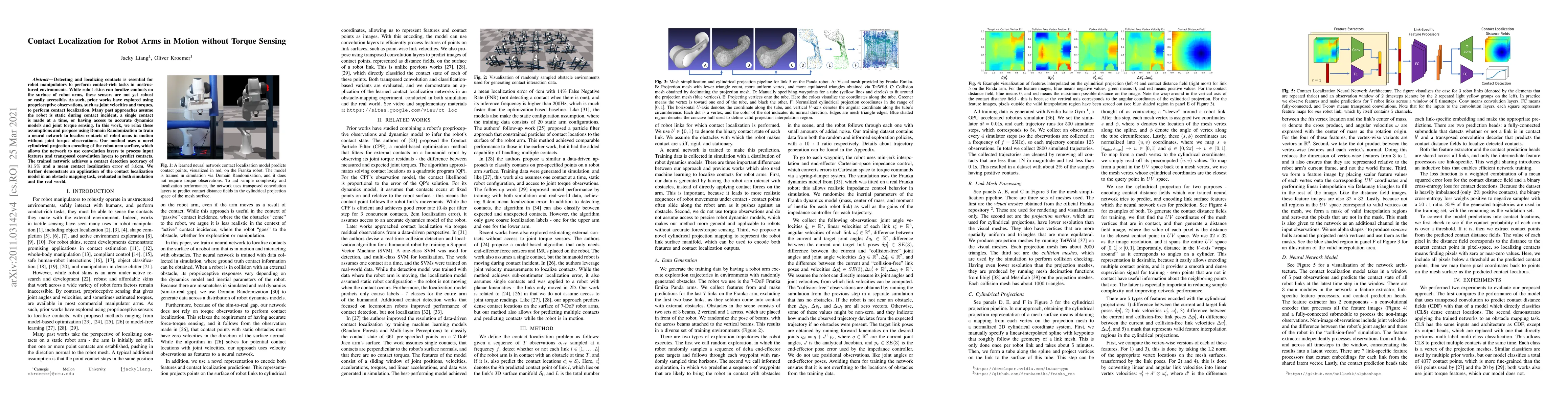 This paper proposes a neural network trained with Domain Randomization to localize contacts on robot arms in motion, without relying on joint torque sensing. The method uses a cylindrical projection encoding of the arm surface and achieves 91.5% detection accuracy and 3.0cm mean localization error, demonstrating its application in obstacle mapping.