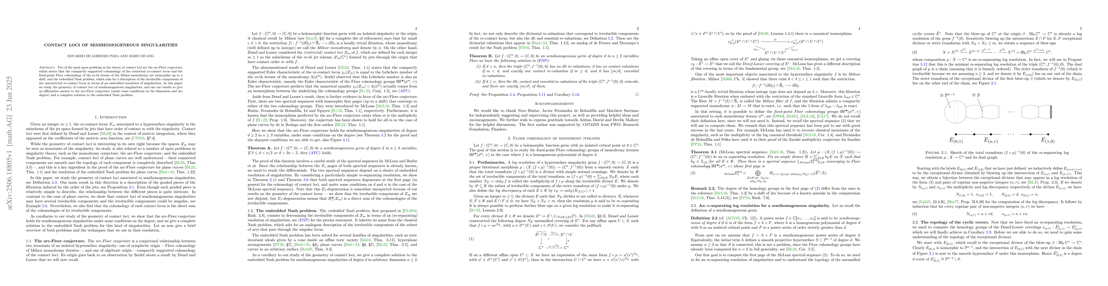 Two of the main open problems in the theory of contact loci are the arc-Floer conjecture, which states that the compactly supported cohomology of the restricted $m$-contact locus and the fixed-point Floer cohomology of the $m$-th iterate of the Milnor monodromy are isomorphic up to a shift; and the embedded Nash problem, which asks for a description of the irreducible components of the unrestricted $m$-contact locus in terms of an embedded resolution of singularities. In this paper we study the geometry of contact loci of semihomogeneous singularities, and use our results to give an affirmative answer to the arc-Floer conjecture (under some conditions on the dimension and the degree) and a complete solution to the embedded Nash problem.