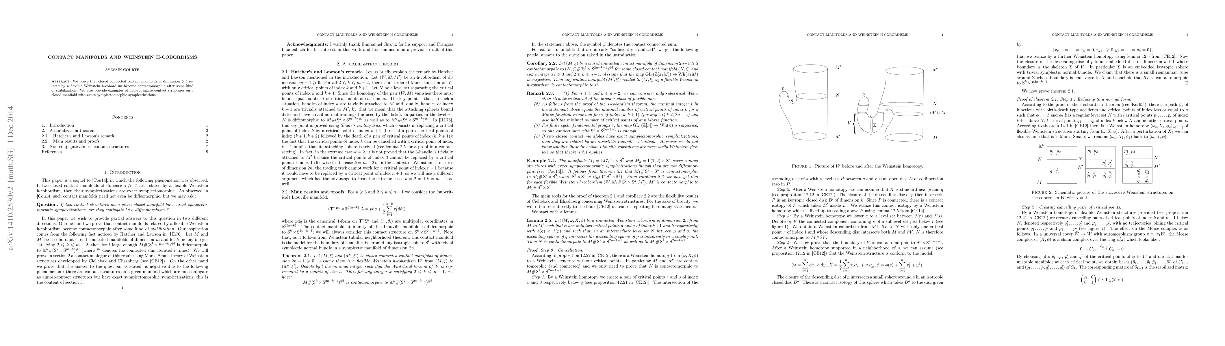 This paper demonstrates that closed connected contact manifolds of dimension ≥ 5 connected by an h-cobordism with a flexible Weinstein structure become contactomorphic after stabilization. It also presents examples of non-conjugate contact structures on a closed manifold with exact, yet non-conjugate, symplectomorphic symplectizations.