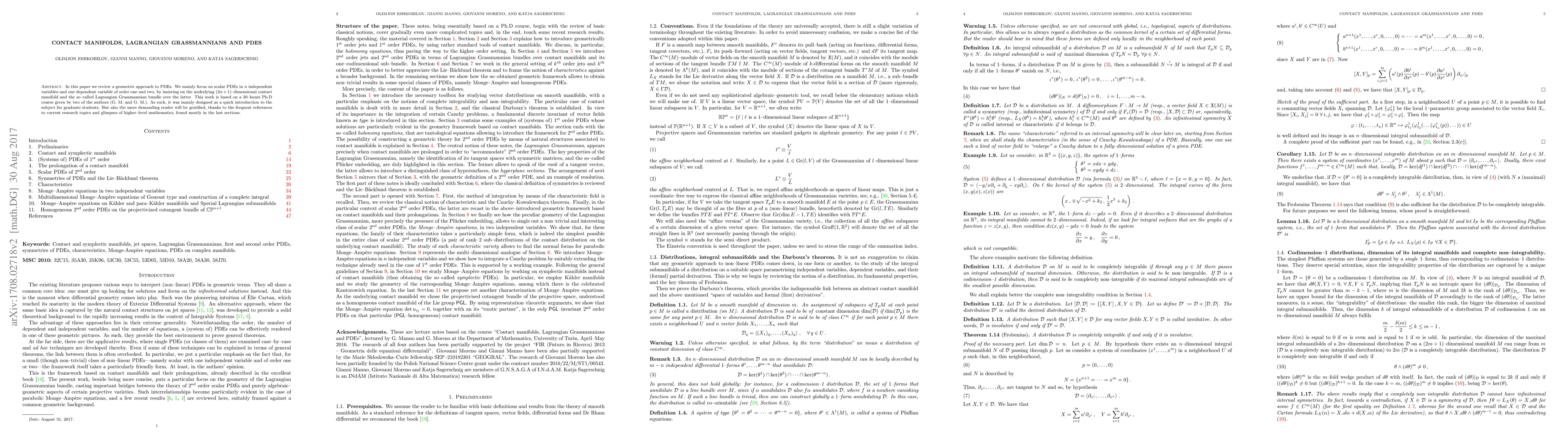 This paper offers a geometric approach to scalar PDEs using contact manifolds and Lagrangian Grassmannians, aimed at introducing the subject to graduate students. It includes references to advanced research topics for more demanding readers.