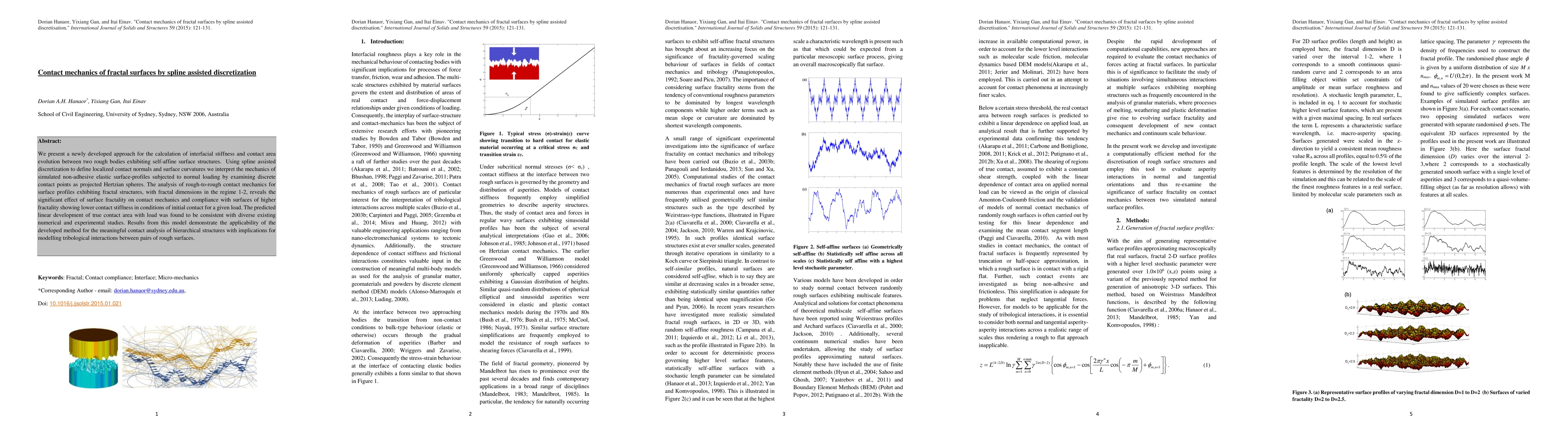 We present a newly developed approach for the calculation of interfacial stiffness and contact area evolution between two rough bodies exhibiting self affine surface structures. Using spline assisted discretization to define localised contact normals and surface curvatures we interpret the mechanics of simulated non-adhesive elastic surface-profiles subjected to normal loading by examining discrete contact points as projected Hertzian spheres. The analysis of rough-to-rough contact mechanics for surface profiles exhibiting fractal structures, with fractal dimensions in the regime 1 2, reveals the significant effect of surface fractality on contact mechanics and compliance with surfaces having the same mean roughness but higher fractality showing lower contact stiffness in conditions of initial contact for a given load. The predicted linear development of true contact area with load was found to be consistent with diverse existing numerical and experimental studies. Results from this model demonstrate the applicability of the developed method for the meaningful contact analysis of hierarchical structures with implications for modelling tribological interactions between pairs of rough surfaces