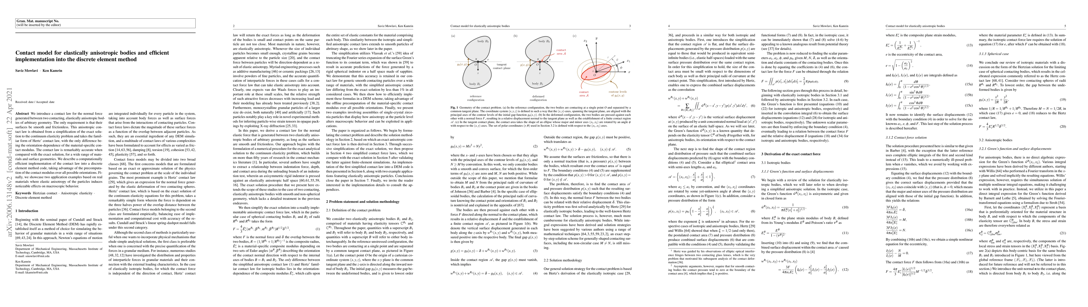 This paper presents an elastically anisotropic contact model for smooth, frictionless surfaces and integrates it into a discrete-element method, highlighting its computational efficiency and application in generating tunable vibrational band gaps in granular crystals. The model, derived from continuum elasticity, accurately reflects material-specific anisotropy effects in macroscopic behavior.