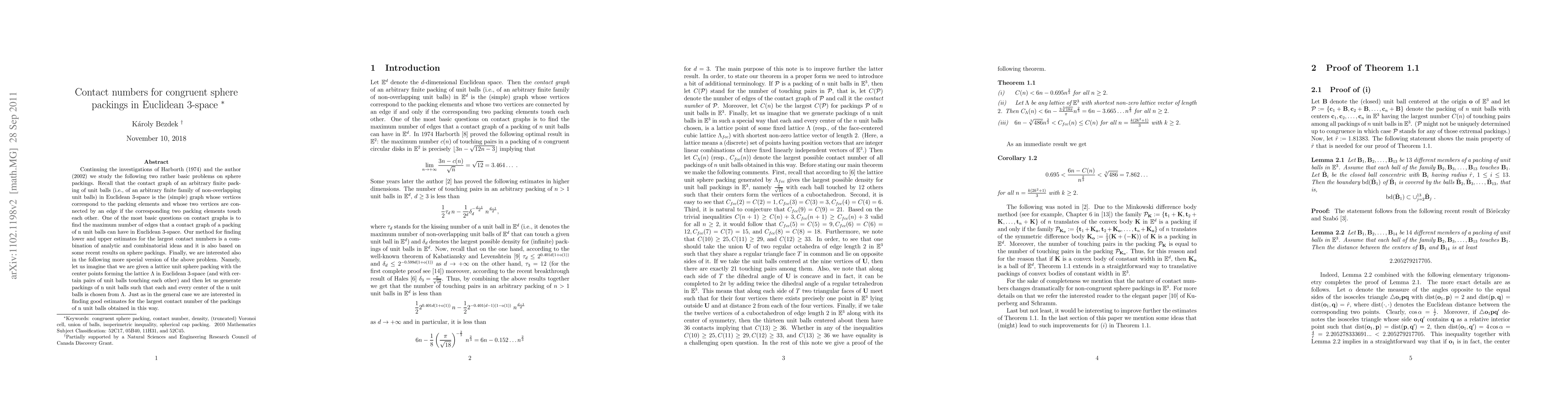 This paper investigates the maximum number of contacts (edges in the contact graph) for packings of n unit spheres in 3-dimensional space, combining analytic and combinatorial methods. It also explores lattice-based packings, focusing on generating packings from a given lattice and estimating their contact numbers.
