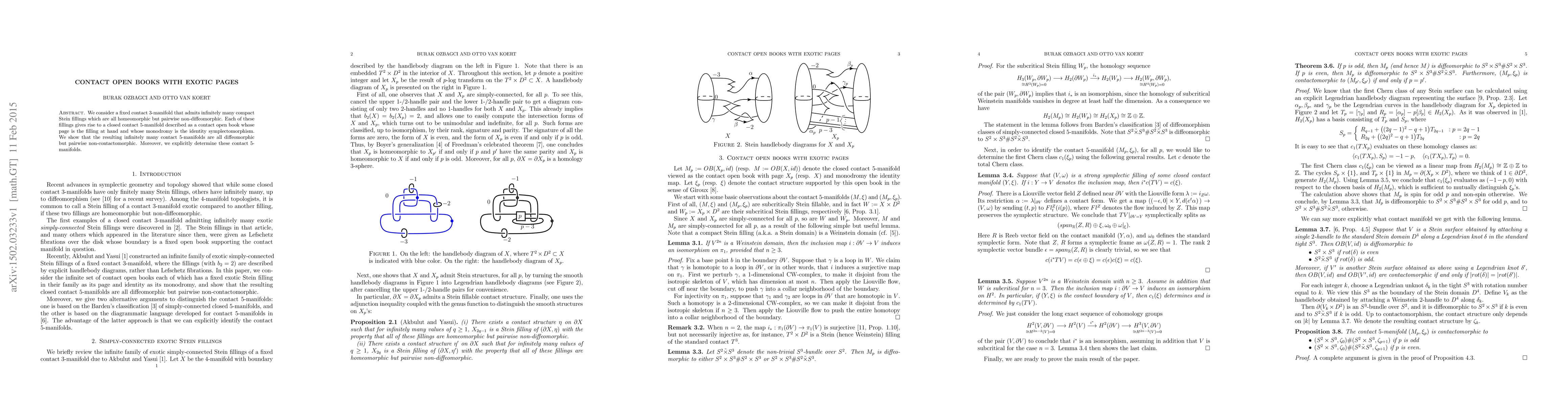 This paper explores a contact 3-manifold with infinitely many distinct Stein fillings, each leading to a unique contact 5-manifold described by a contact open book. Despite the manifolds being pairwise non-diffeomorphic, the resulting contact 5-manifolds are shown to be diffeomorphic but not contactomorphic.