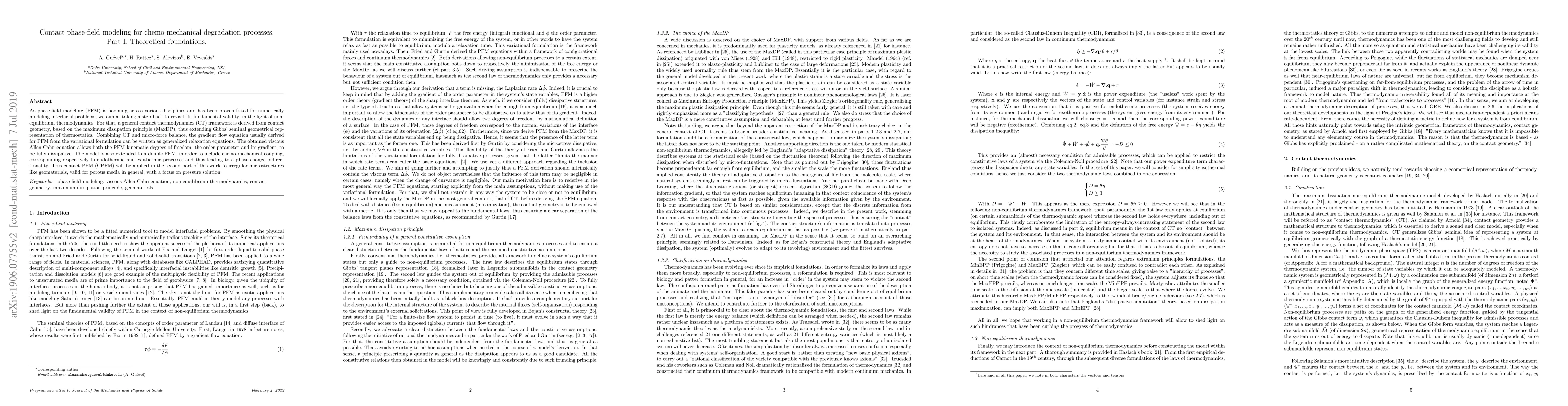 As phase-field modeling (PFM) is booming across various disciplines and has been proven fitted for numerically modeling interfacial problems, we aim at taking a step back to revisit its fundamental validity, in the light of non-equilibrium thermodynamics. For that, a general contact thermodynamics (CT) framework is derived from contact geometry, based on the maximum dissipation principle (MaxDP), thus extending Gibbs' seminal geometrical representation of thermostatics. Combining CT and micro-force balance, the gradient flow equation usually derived for PFM from the variational formulation can be written as generalized relaxation equations. The obtained viscous Allen-Cahn equation allows both the PFM kinematic degrees of freedom, the order parameter and its gradient, to be fully dissipative. The model is also extended to a double PFM, in order to include chemo-mechanical coupling, corresponding respectively to endothermic and exothermic processes and thus leading to a phase change bidirectionality. This contact PFM (CPFM) will be applied in the second part of this work to irregular microstructures like geomaterials, valid for porous media in general, with a focus on pressure solution.