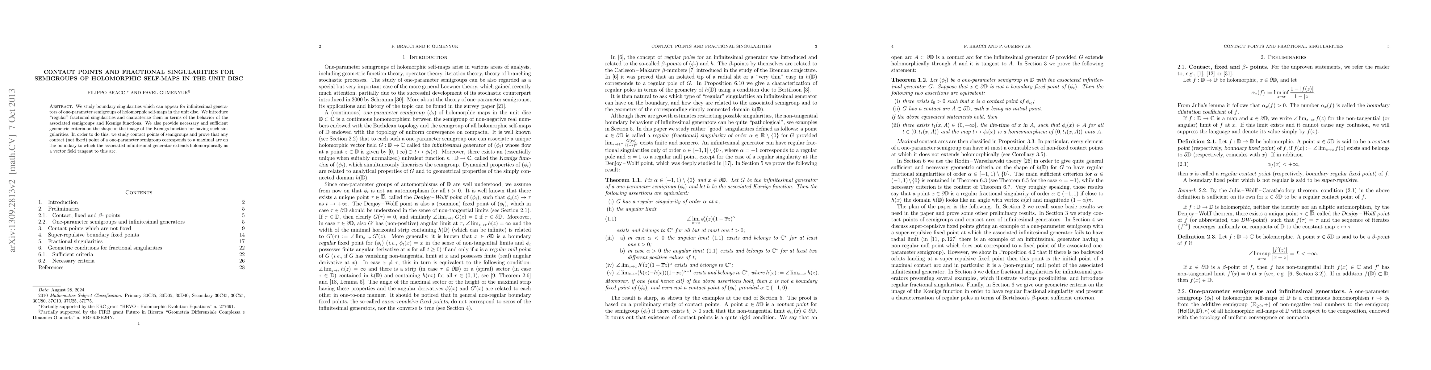 We study boundary singularities which can appear for infinitesimal generators of one-parameter semigroups of holomorphic self-maps in the unit disc. We introduce "regular" fractional singularities and characterize them in terms of the behavior of the associated semigroups and Koenigs functions. We also provide necessary and sufficient geometric criteria on the shape of the image of the Koenigs function for having such singularities. In order to do this, we study contact points of semigroups and prove that any contact (not fixed) point of a one-parameter semigroup corresponds to a maximal arc on the boundary to which the associated infinitesimal generator extends holomorphically as a vector field tangent to this arc.