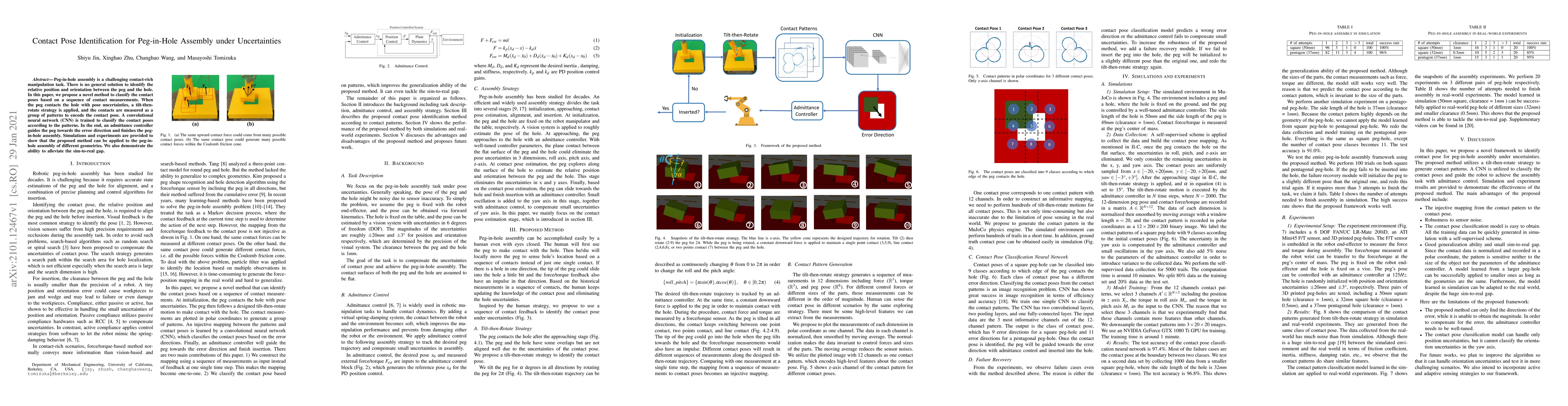 This paper proposes a novel method using a convolutional neural network to classify contact poses for peg-in-hole assembly under uncertainties, employing a tilt-then-rotate strategy and admittance control to achieve successful assembly across different geometries. Simulation and experimental results validate the method's effectiveness and its ability to bridge the sim-to-real gap.