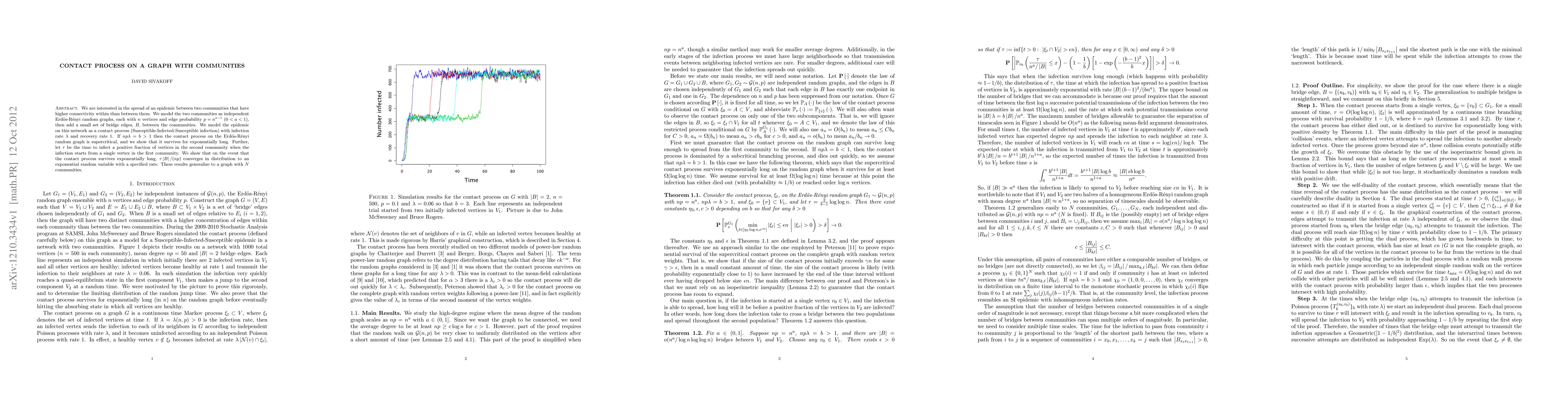 We are interested in the spread of an epidemic between two communities that have higher connectivity within than between them. We model the two communities as independent Erdos-Renyi random graphs, each with n vertices and edge probability p = n^{a-1} (0 1 then the contact process on the Erdos-Renyi random graph is supercritical, and we show that it survives for exponentially long. Further, let \tau be the time to infect a positive fraction of vertices in the second community when the infection starts from a single vertex in the first community. We show that on the event that the contact process survives exponentially long, \tau |B|/(np) converges in distribution to an exponential random variable with a specified rate. These results generalize to a graph with N communities.
