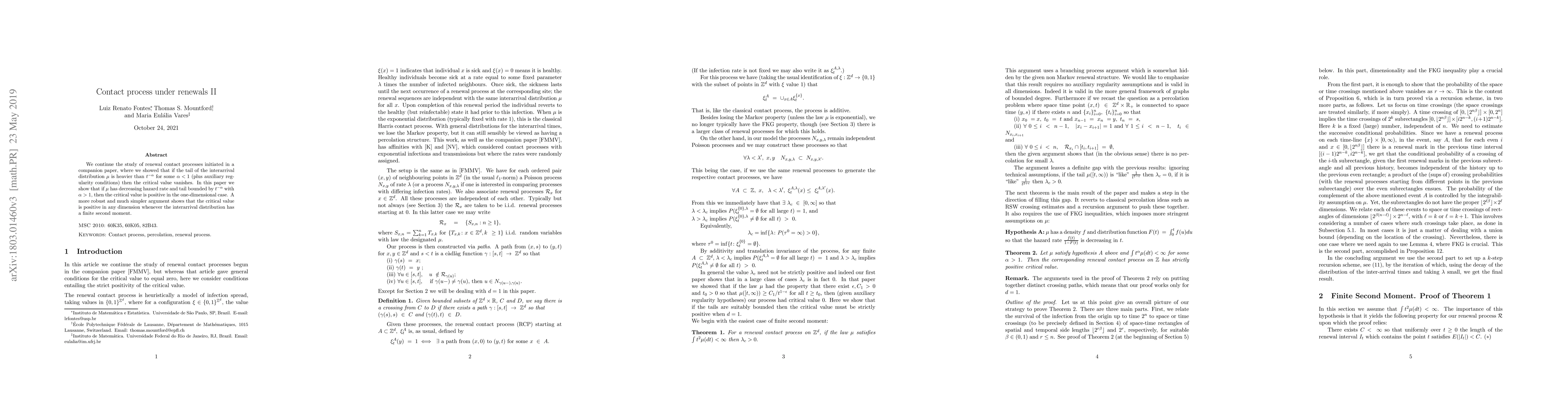 We continue the study of renewal contact processes initiated in a companion paper, where we showed that if the tail of the interarrival distribution $\mu$ is heavier than $t^{-\alpha}$ for some $\alpha <1$ (plus auxiliary regularity conditions) then the critical value vanishes. In this paper we show that if $\mu$ has decreasing hazard rate and tail bounded by $t^{-\alpha}$ with $\alpha >1$, then the critical value is positive in the one-dimensional case. A more robust and much simpler argument shows that the critical value is positive in any dimension whenever the interarrival distribution has a finite second moment.
