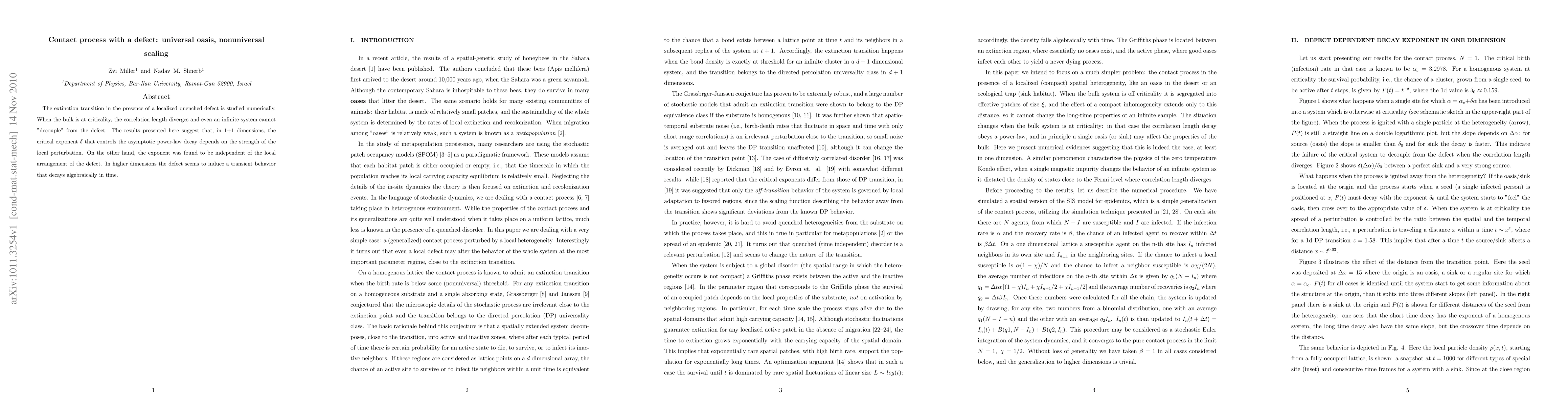 The research numerically investigates extinction transitions near a localized defect in a contact process, finding that the critical exponent u03bd depends on defect strength in 1+1 dimensions, but not on its arrangement. In higher dimensions, the defect triggers transient algebraic decay.