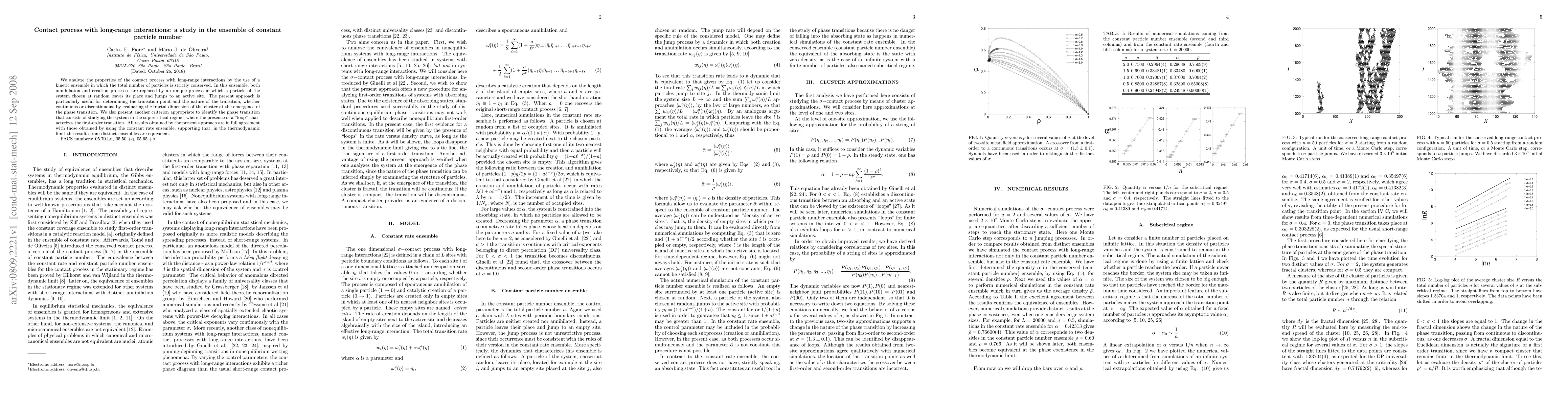 We analyze the properties of the contact process with long-range interactions by the use of a kinetic ensemble in which the total number of particles is strictly conserved. In this ensemble, both annihilation and creation processes are replaced by an unique process in which a particle of the system chosen at random leaves its place and jumps to an active site. The present approach is particularly useful for determining the transition point and the nature of the transition, whether continuous or discontinuous, by evaluating the fractal dimension of the cluster at the emergence of the phase transition. We also present another criterion appropriate to identify the phase transition that consists of studying the system in the supercritical regime, where the presence of a "loop" characterizes the first-order transition. All results obtained by the present approach are in full agreement with those obtained by using the constant rate ensemble, supporting that, in the thermodynamic limit the results from distinct ensembles are equivalent.