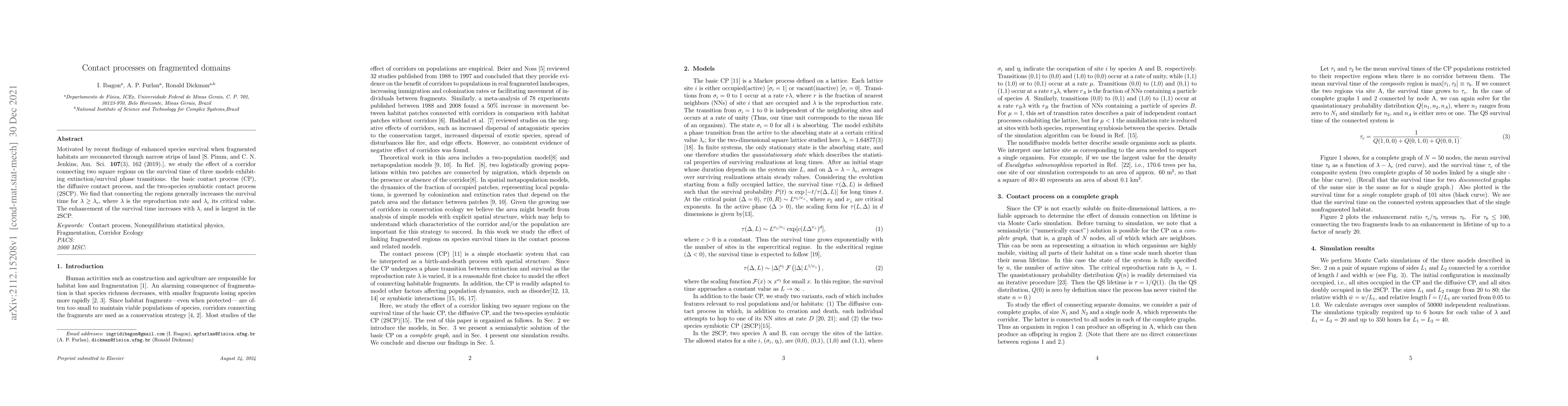 Motivated by recent findings of enhanced species survival when fragmented habitats are reconnected through narrow strips of land [S. Pimm, and C. N. Jenkins, Am. Sci. {\bf 107}(3), 162 (2019).], we study the effect of a corridor connecting two square regions on the survival time of three models exhibiting extinction/survival phase transitions: the basic contact process (CP), the diffusive contact process, and the two-species symbiotic contact process (2SCP). We find that connecting the regions generally increases the survival time for $\lambda\ge \lambda_c$, where $\lambda$ is the reproduction rate and $\lambda_c$ its critical value. The enhancement of the survival time increases with $\lambda$, and is largest in the 2SCP.