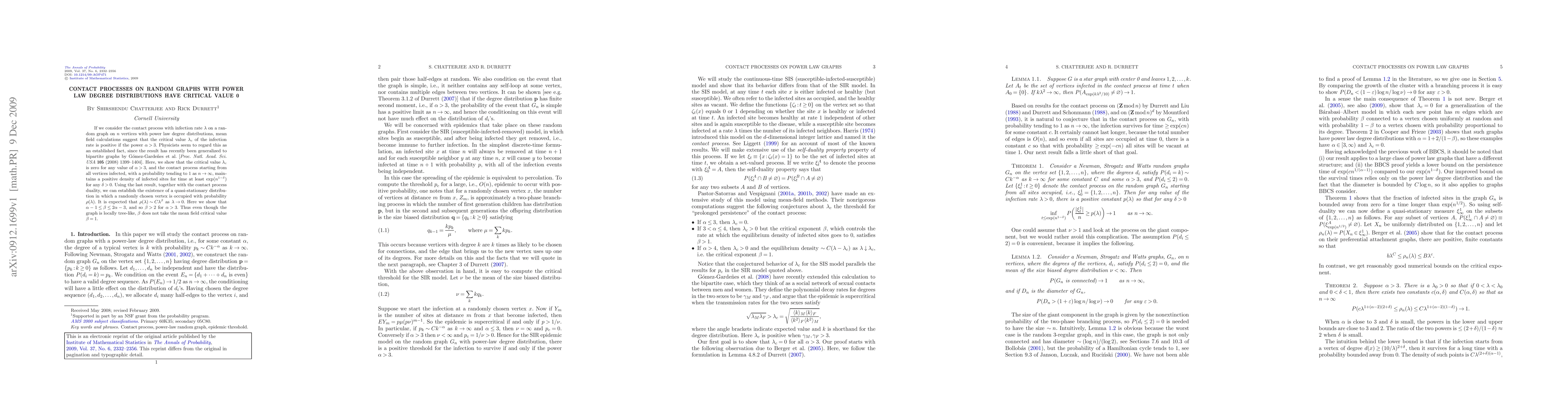 A study finds that the critical value of infection rate for a contact process on random graphs with power law degree distributions is zero for any value of alpha greater than 3, contradicting established facts.
