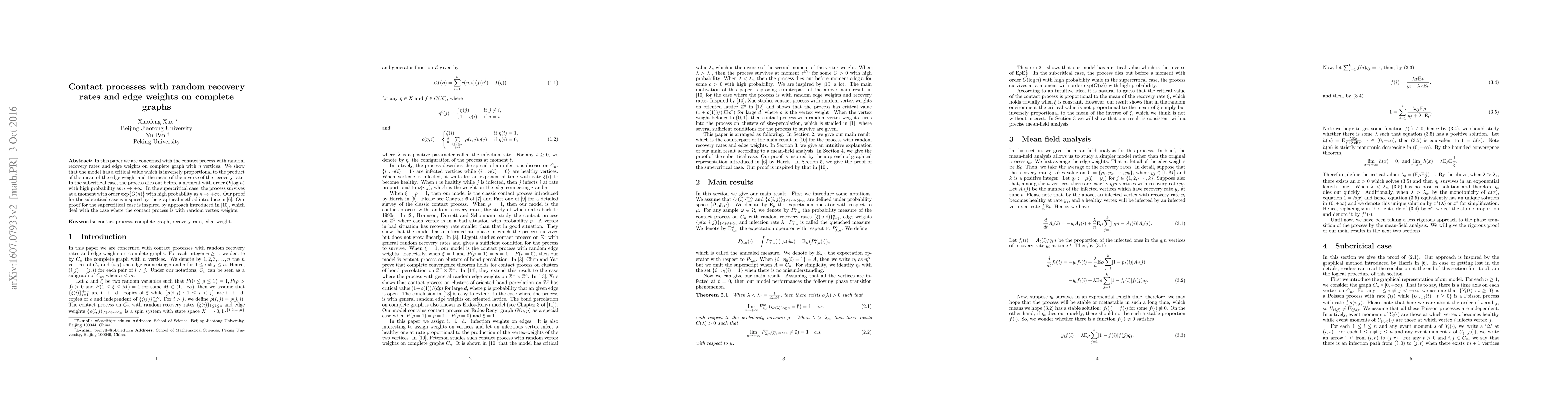 This paper investigates the contact process on a complete graph with random recovery rates and edge weights, demonstrating a critical value inversely proportional to the product of mean edge weights and mean recovery rates. The process dies out with logarithmic order in the subcritical regime and survives exponentially in the supercritical regime as the graph size grows.