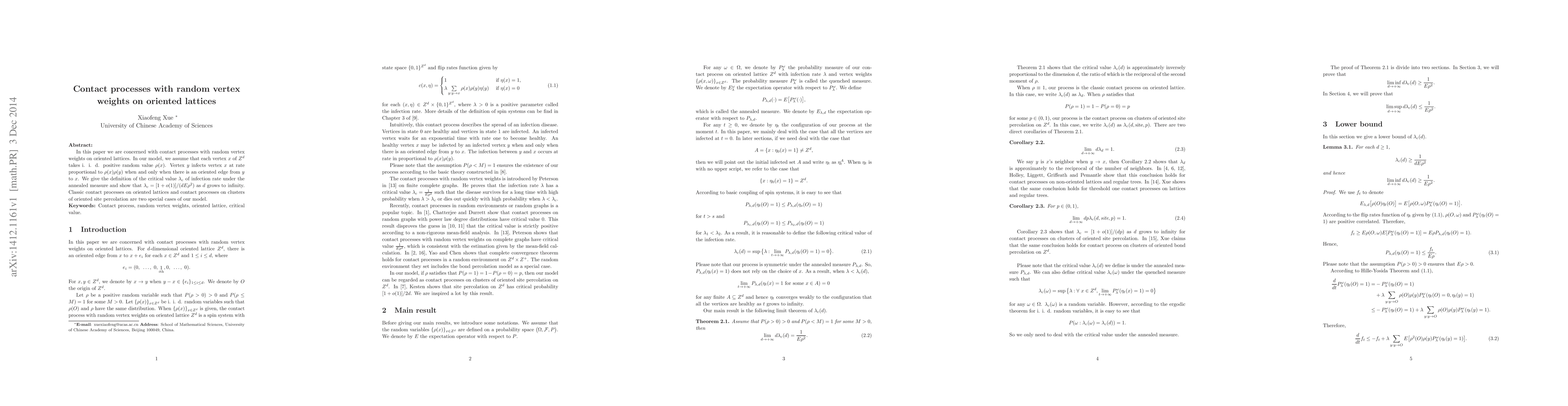 The paper analyzes contact processes with random vertex weights on oriented lattices, defining the critical value \(\lambda_c\) of infection rate under annealed measure and showing its asymptotic behavior as \(d\) grows to infinity.