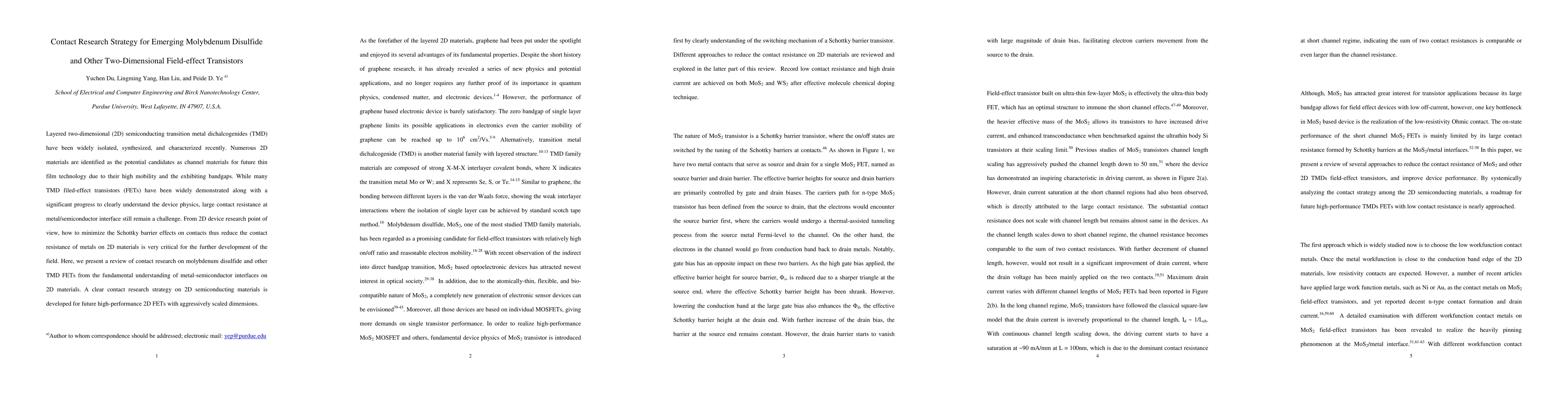 This paper reviews contact research on molybdenum disulfide and other two-dimensional field-effect transistors to minimize Schottky barrier effects and reduce contact resistance, aiming for high-performance 2D FETs with scaled dimensions.