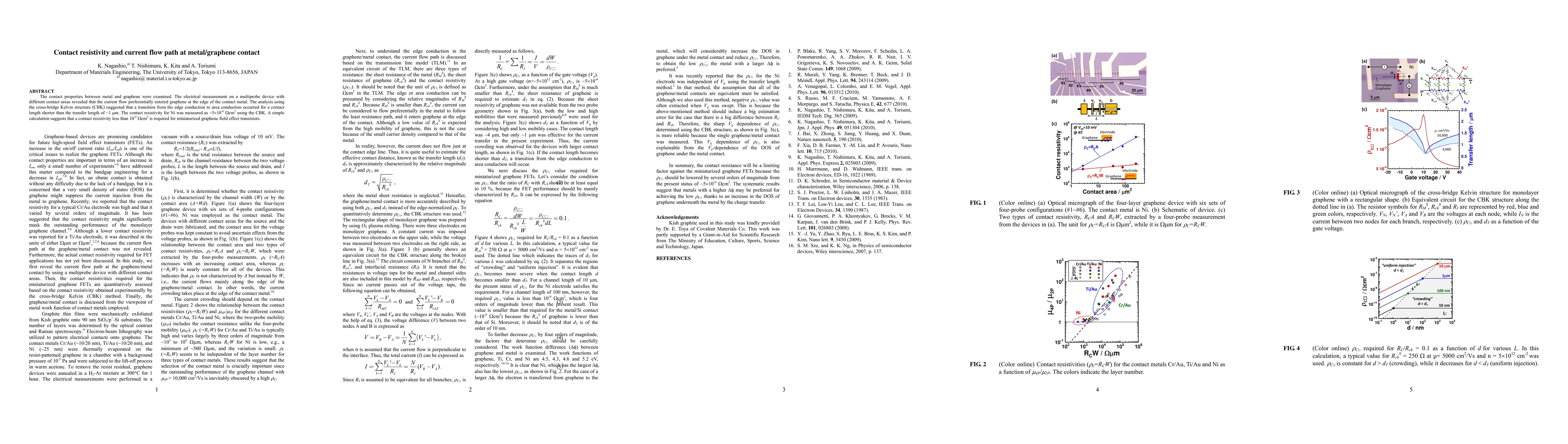The study examines metal/graphene contact properties, finding current enters graphene mainly at the metal edge. Contact resistivity for Ni is ~5*10^-6 Ohmcm², suggesting a resistivity below 10^-9 Ohmcm² is necessary for miniaturized graphene transistors.
