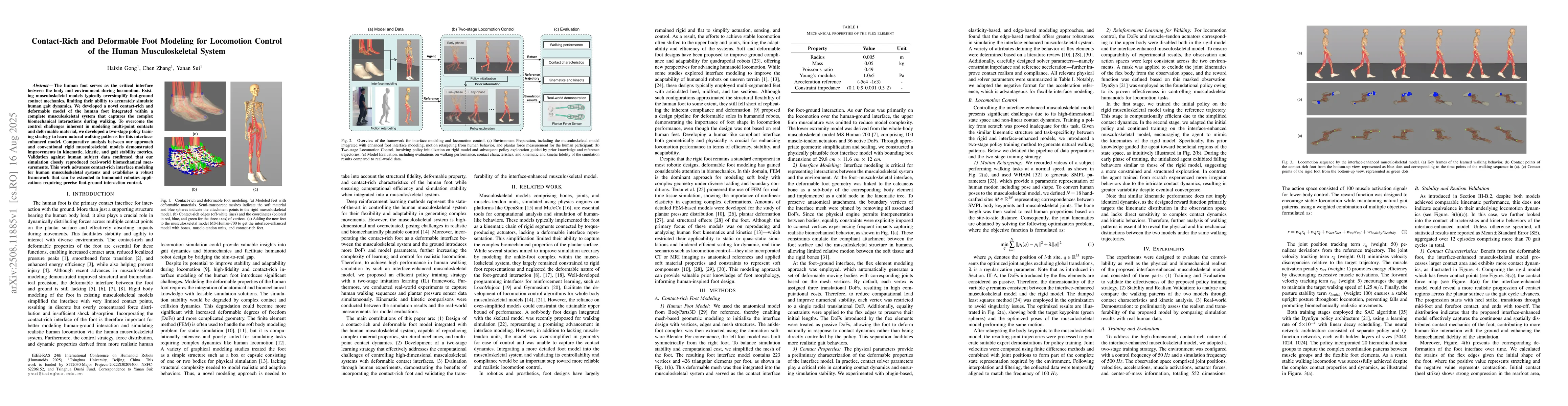 The human foot serves as the critical interface between the body and environment during locomotion. Existing musculoskeletal models typically oversimplify foot-ground contact mechanics, limiting their ability to accurately simulate human gait dynamics. We developed a novel contact-rich and deformable model of the human foot integrated within a complete musculoskeletal system that captures the complex biomechanical interactions during walking. To overcome the control challenges inherent in modeling multi-point contacts and deformable material, we developed a two-stage policy training strategy to learn natural walking patterns for this interface-enhanced model. Comparative analysis between our approach and conventional rigid musculoskeletal models demonstrated improvements in kinematic, kinetic, and gait stability metrics. Validation against human subject data confirmed that our simulation closely reproduced real-world biomechanical measurements. This work advances contact-rich interface modeling for human musculoskeletal systems and establishes a robust framework that can be extended to humanoid robotics applications requiring precise foot-ground interaction control.