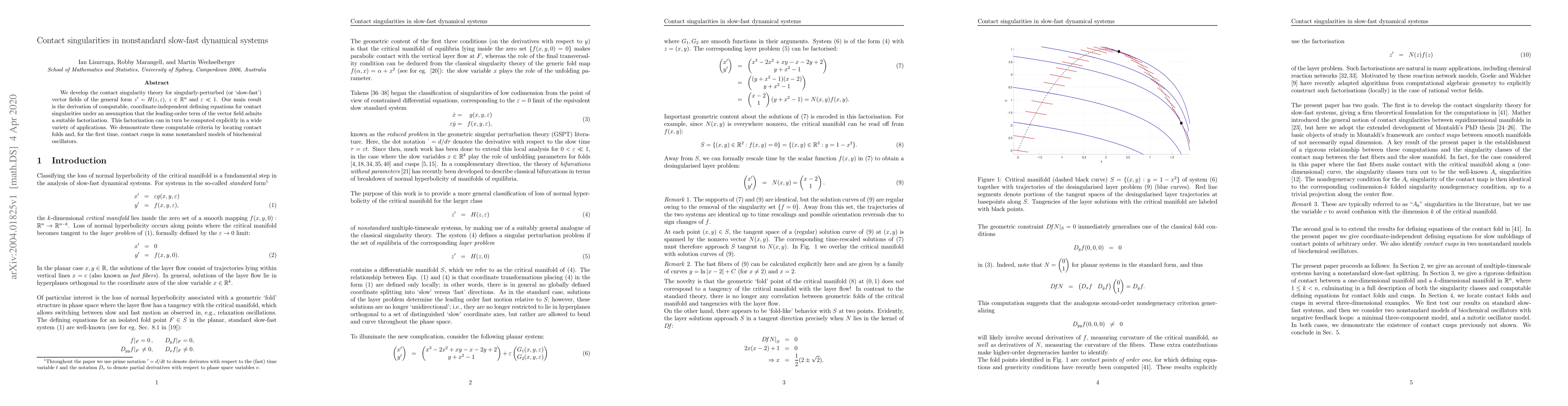 Researchers developed a theory for contact singularities in slow-fast dynamical systems, providing defining equations that can be computed using suitable factorization of the leading-order vector field term.