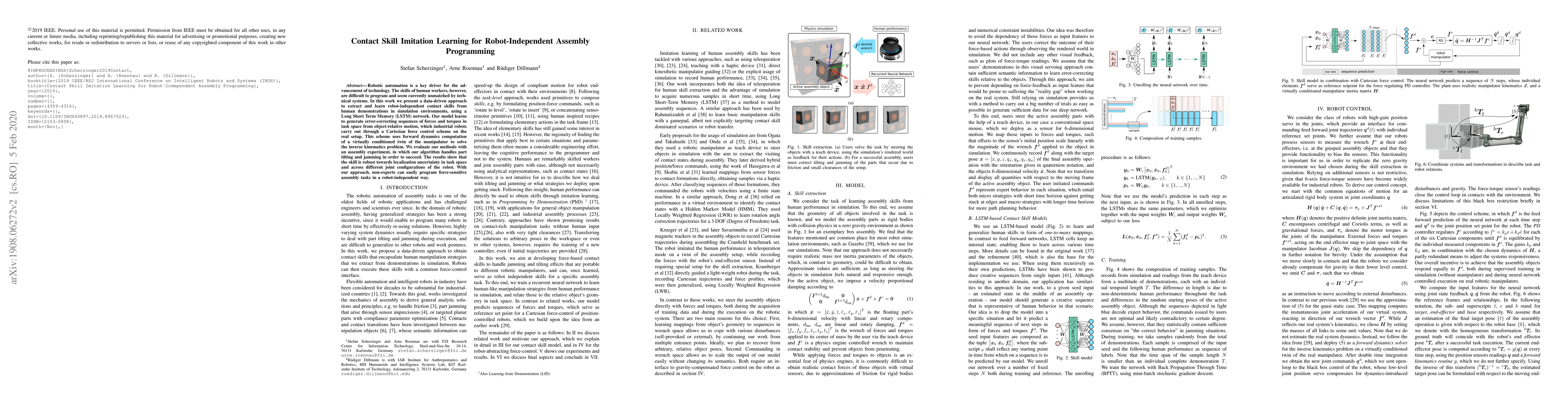 Robotic automation is a key driver for the advancement of technology. The skills of human workers, however, are difficult to program and seem currently unmatched by technical systems. In this work we present a data-driven approach to extract and learn robot-independent contact skills from human demonstrations in simulation environments, using a Long Short Term Memory (LSTM) network. Our model learns to generate error-correcting sequences of forces and torques in task space from object-relative motion, which industrial robots carry out through a Cartesian force control scheme on the real setup. This scheme uses forward dynamics computation of a virtually conditioned twin of the manipulator to solve the inverse kinematics problem. We evaluate our methods with an assembly experiment, in which our algorithm handles part tilting and jamming in order to succeed. The results show that the skill is robust towards localization uncertainty in task space and across different joint configurations of the robot. With our approach, non-experts can easily program force-sensitive assembly tasks in a robot-independent way.