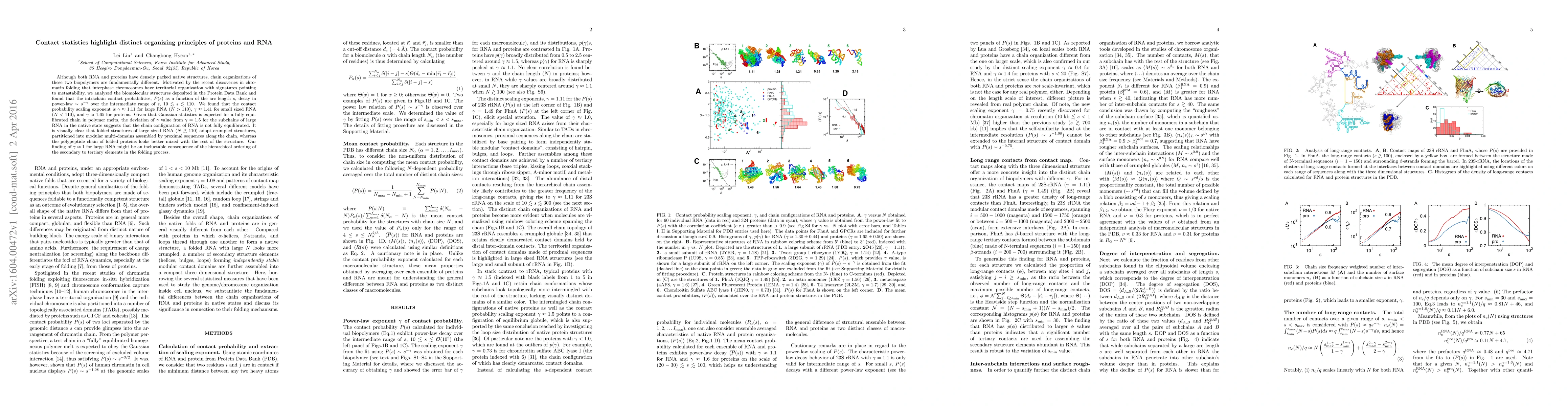Although both RNA and proteins have densely packed native structures, chain organizations of these two biopolymers are fundamentally different. Motivated by the recent discoveries in chromatin folding that interphase chromosomes have territorial organization with signatures pointing to metastability, we analyzed the biomolecular structures deposited in the Protein Data Bank and found that the intrachain contact probabilities, $P(s)$ as a function of the arc length $s$, decay in power-law $\sim s^{-\gamma}$ over the intermediate range of $s$, $10\lesssim s\lesssim 110$. We found that the contact probability scaling exponent is $\gamma\approx 1.11$ for large RNA ($N>110$), $\gamma\approx 1.41$ for small sized RNA ($N<110$), and $\gamma\approx 1.65$ for proteins. Given that Gaussian statistics is expected for a fully equilibrated chain in polymer melts, the deviation of $\gamma$ value from $\gamma=1.5$ for the subchains of large RNA in the native state suggests that the chain configuration of RNA is not fully equilibrated. It is visually clear that folded structures of large sized RNA ($N\gtrsim 110$) adopt crumpled structures, partitioned into modular multi-domains assembled by proximal sequences along the chain, whereas the polypeptide chain of folded proteins looks better mixed with the rest of the structure. Our finding of $\gamma\approx 1$ for large RNA might be an ineluctable consequence of the hierarchical ordering of the secondary to tertiary elements in the folding process.